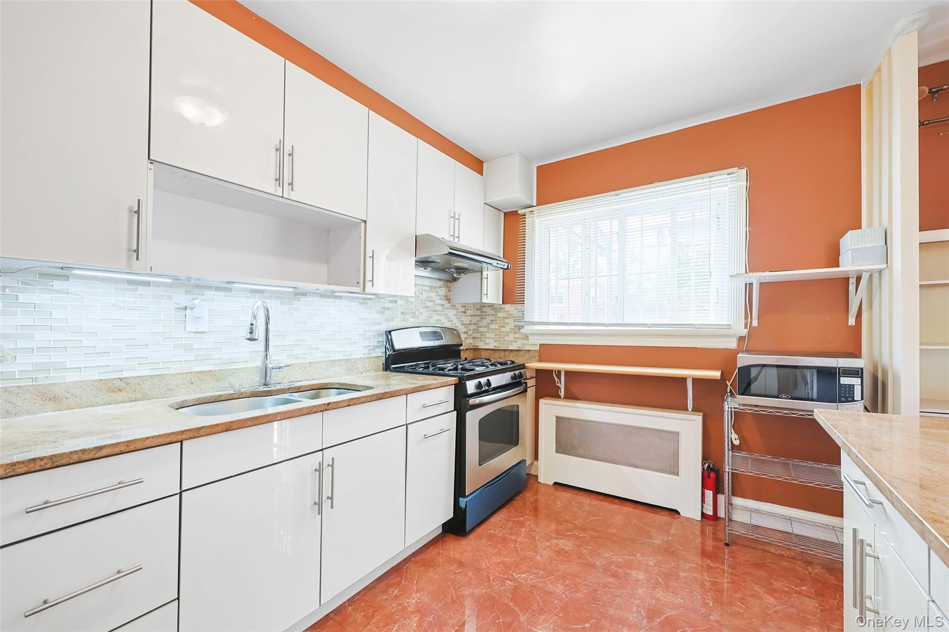 - Kitchen with white cabinetry, appliances with stainless steel finishes, backsplash, under cabinet range hood, and light stone countertops
