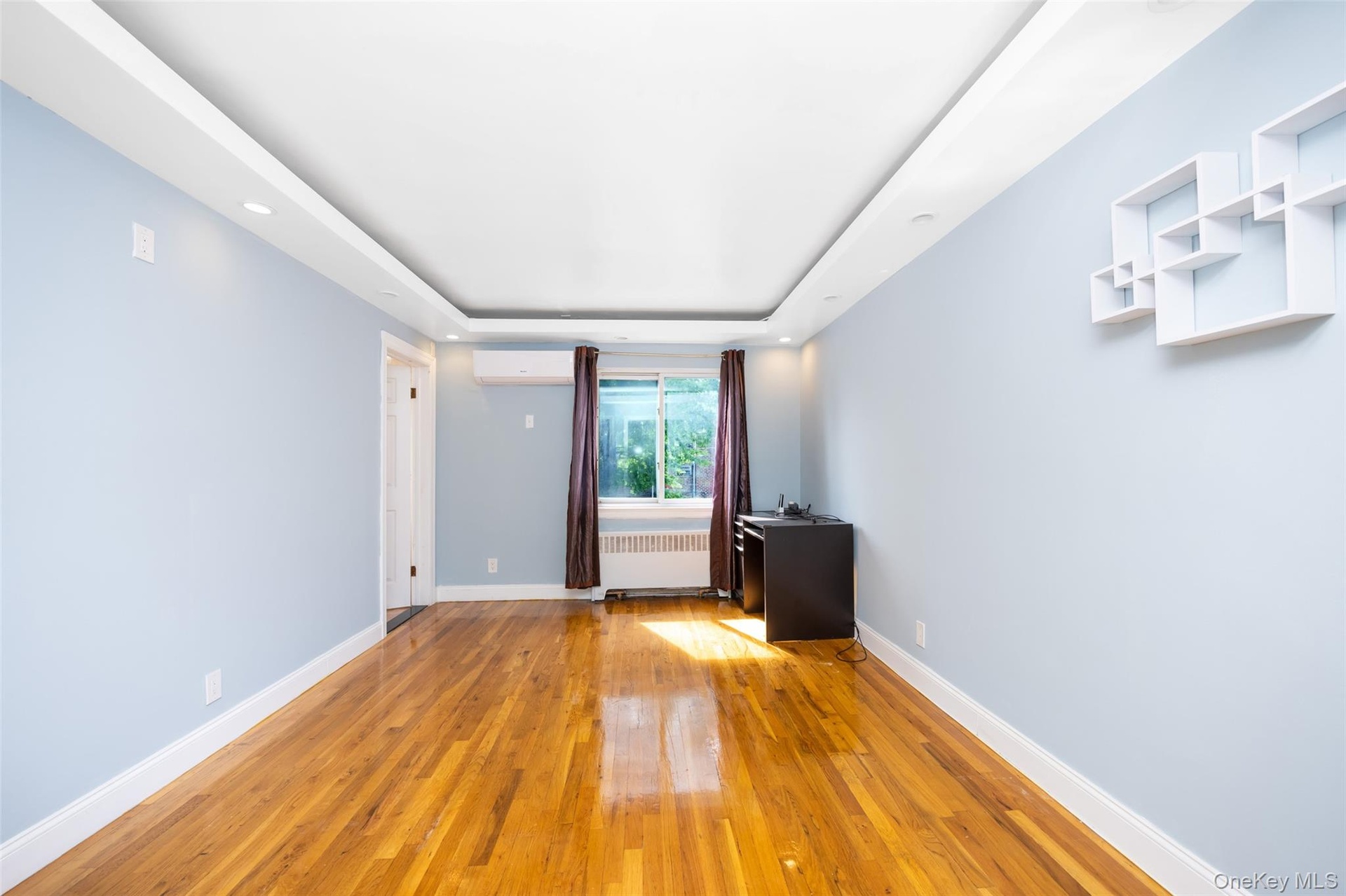 - Empty room featuring light wood-type flooring, radiator, a raised ceiling, and a wall mounted air conditioner