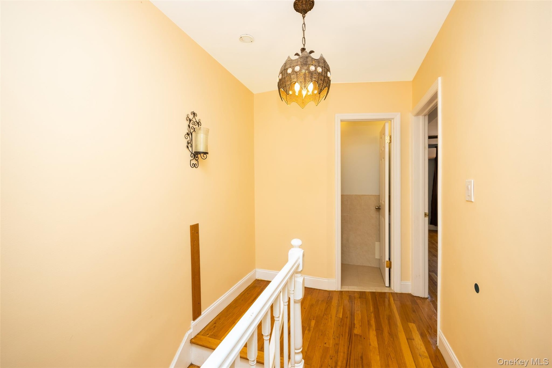 - Hall with an upstairs landing, a chandelier, and light wood-style flooring
