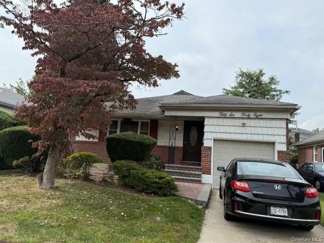 - View of front of home featuring brick siding, a front lawn, driveway, and an attached garage