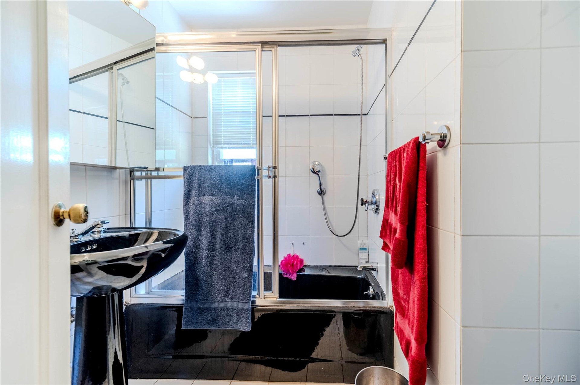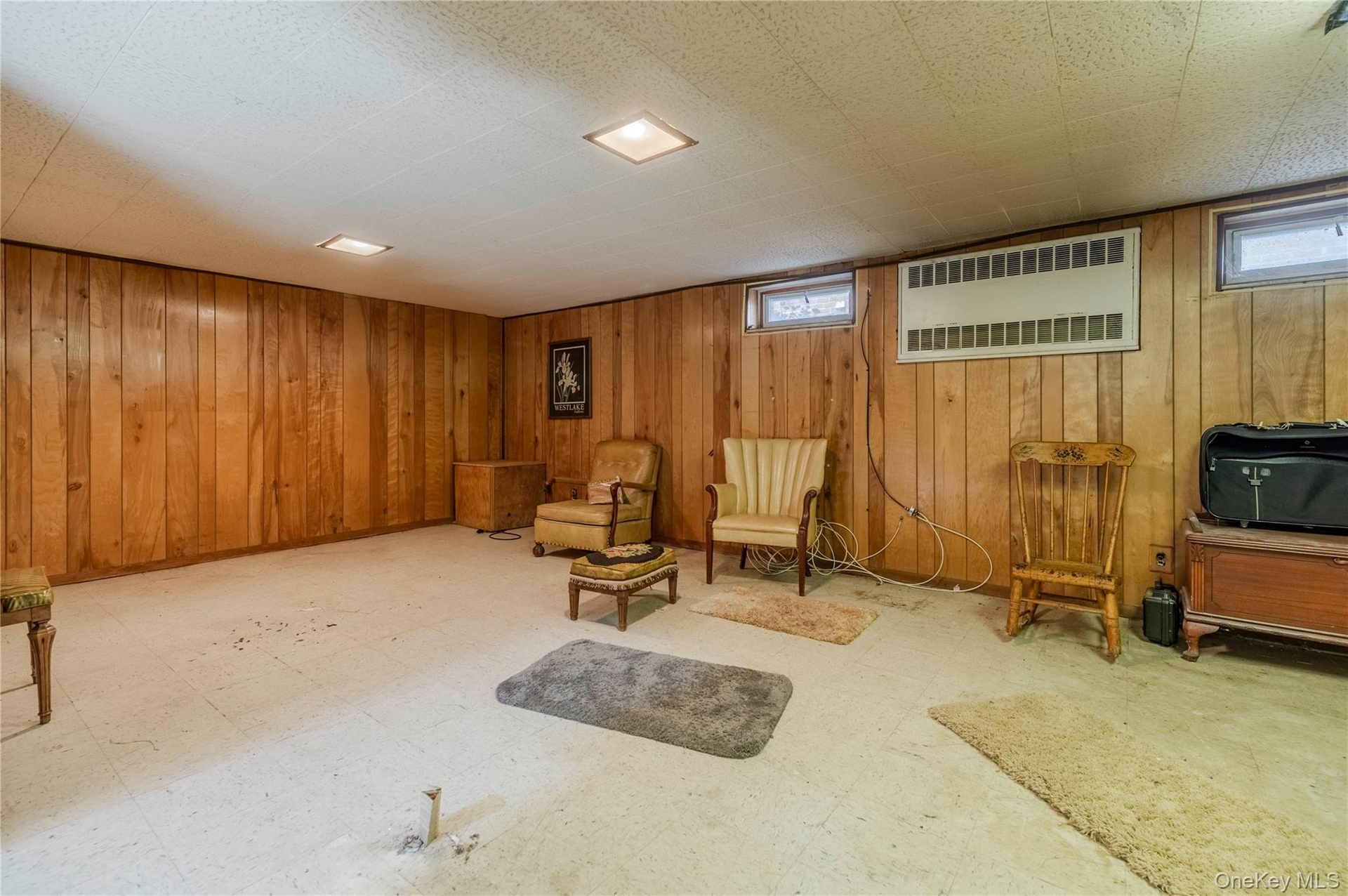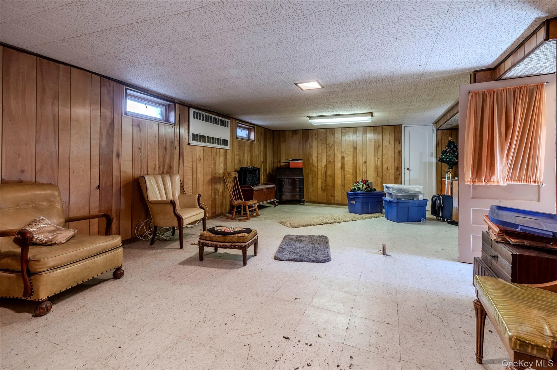 - Living area with tile patterned floors, healthy amount of natural light, and wooden walls