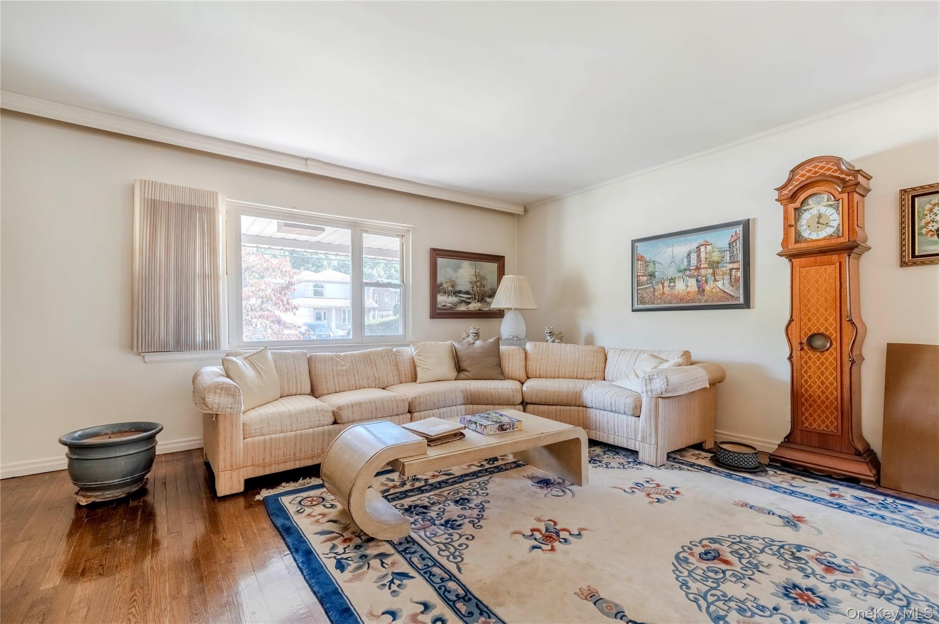 - Living area featuring wood finished floors, crown molding, and radiator heating unit