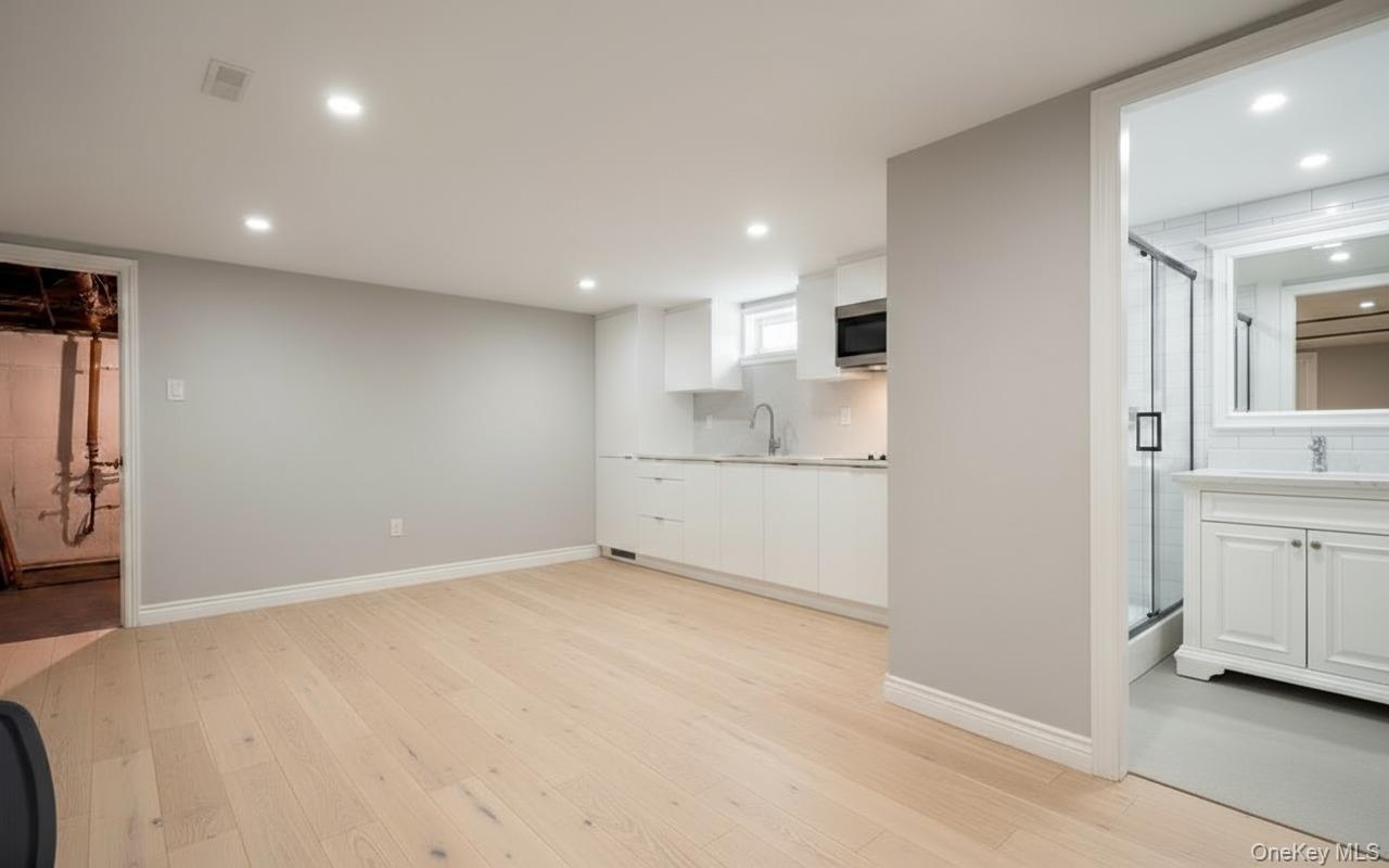 - Virtually Staged basement area with light wood-style flooring, recessed lighting, and crown molding