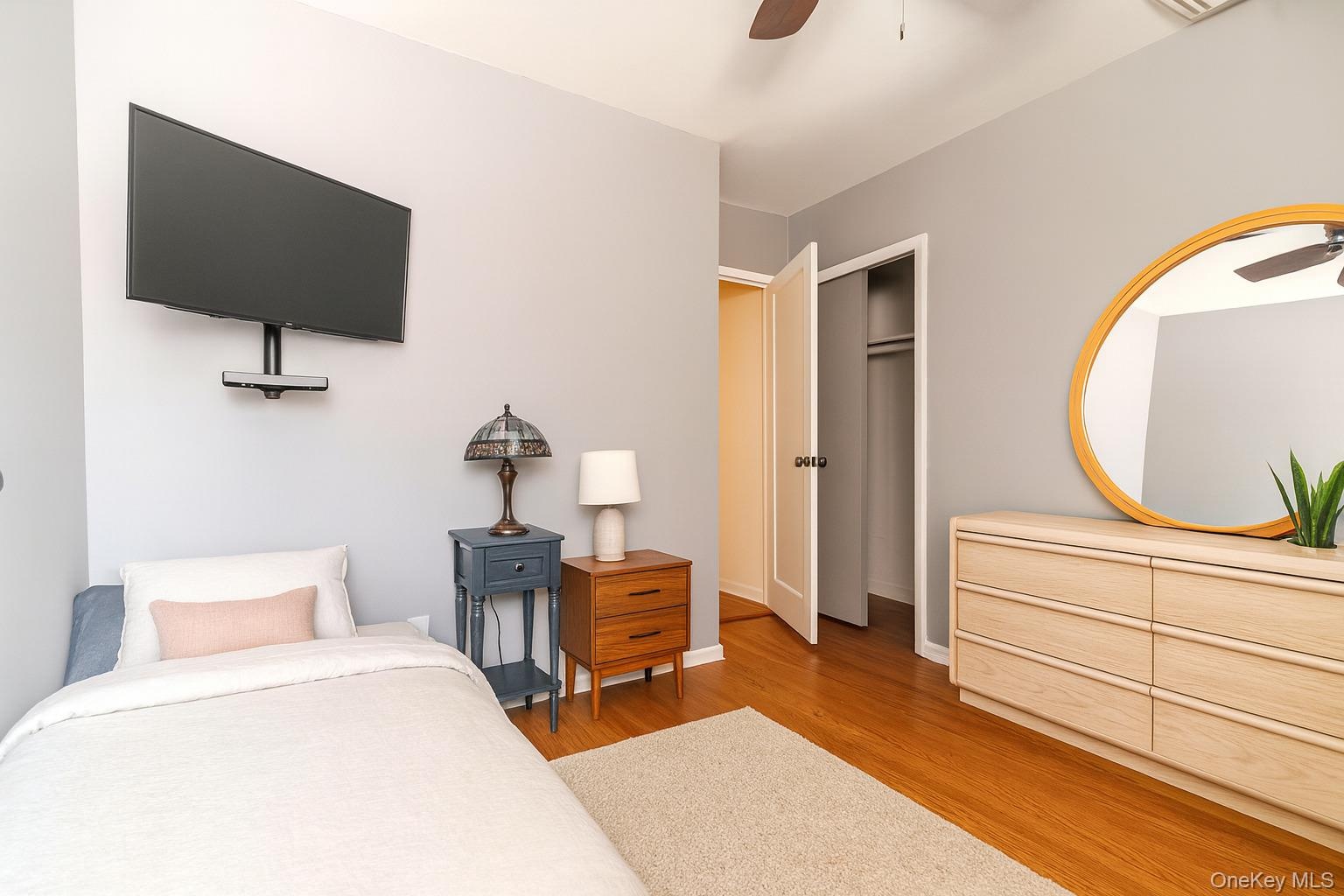 - Virtually Staged Bedroom with light wood finished floors, a closet, and ceiling fan