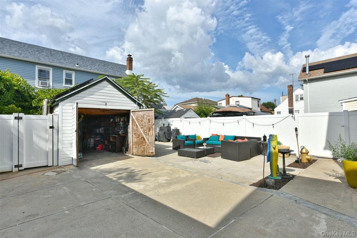 - Fenced backyard with an outdoor living space, a storage unit, and a patio area