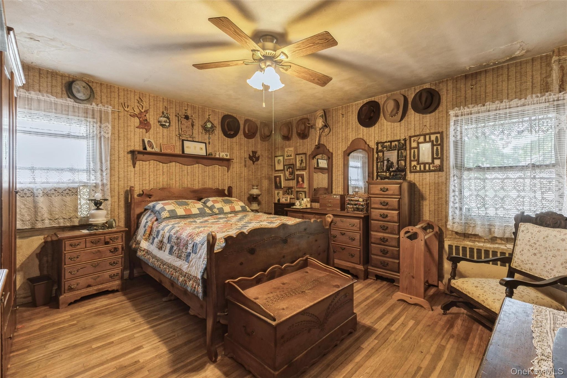- Bedroom featuring wood finished floors, a ceiling fan, and wallpapered walls
