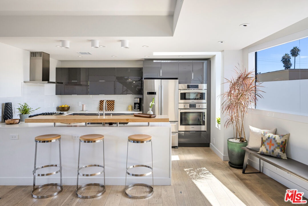 This gated, front-facing detached townhome is flooded with natural light on three sides with a one-of-a-kind rooftop terrace that has jaw-dropping panoramic views. Thoughtful modern design with angular lines. Custom windows throughout make the open concept living / kitchen / dining area light and bright. European-style kitchen equipped with high-end stainless steel appliances, quartz countertops, and custom cabinetry. Generously-sized bedrooms with en-suite baths. Ground level flex space with its own half bath, perfect for a office or studio space. Features include a floating staircase, wide plank floors throughout, built-in's, multiple balconies, firepit and a rooftop terrace (and shaded pergola) that will be the envy of your guests where sunset cocktails can turn into midnight conversations. Steps from iconic hotspots, upscale restaurants (Gwen, Superba, L'Antica Pizzeria da Michele), nightlife, Runyon, and the beating pulse of Los Angeles.