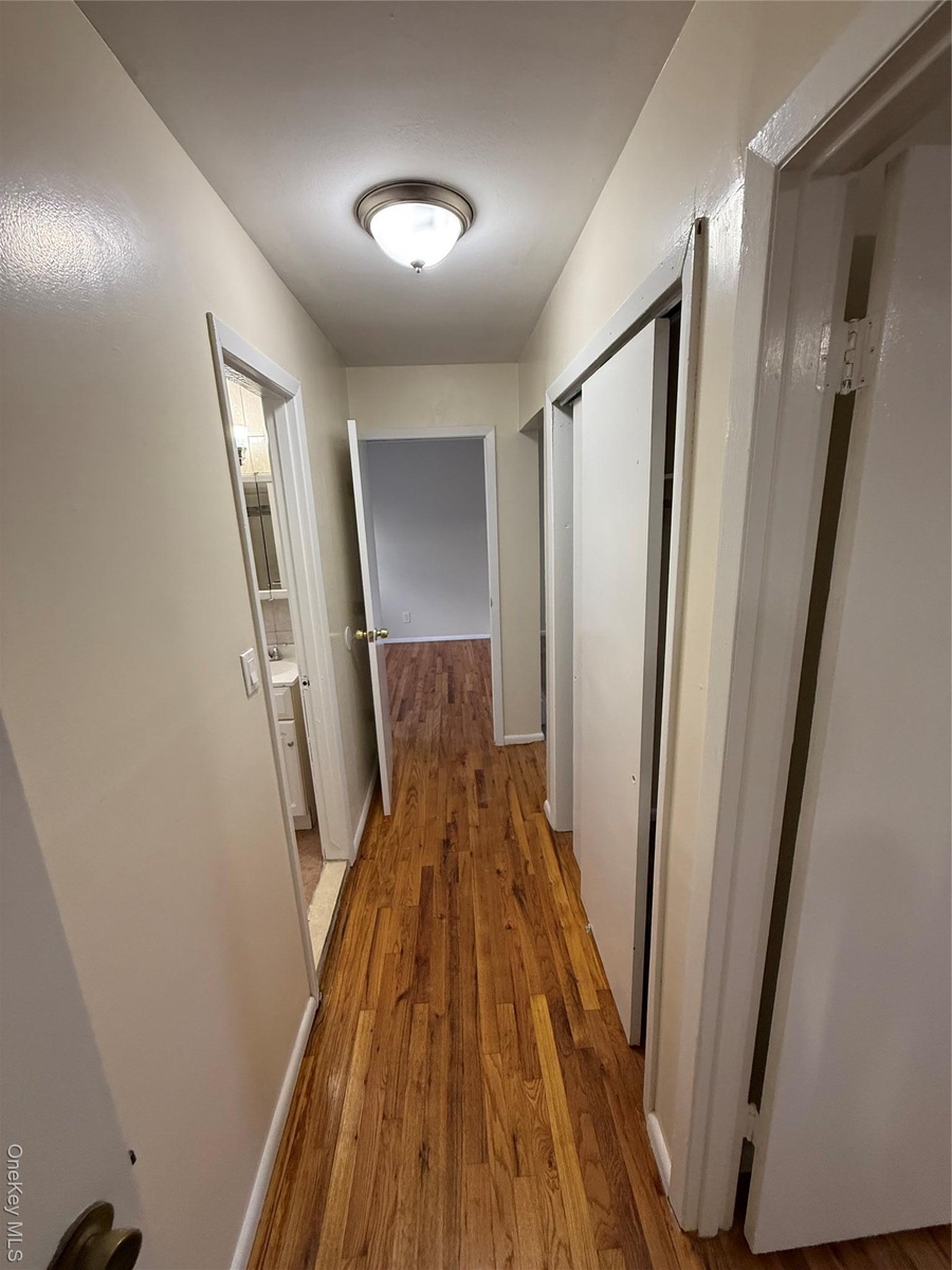 - Corridor featuring wood finished floors and baseboards
