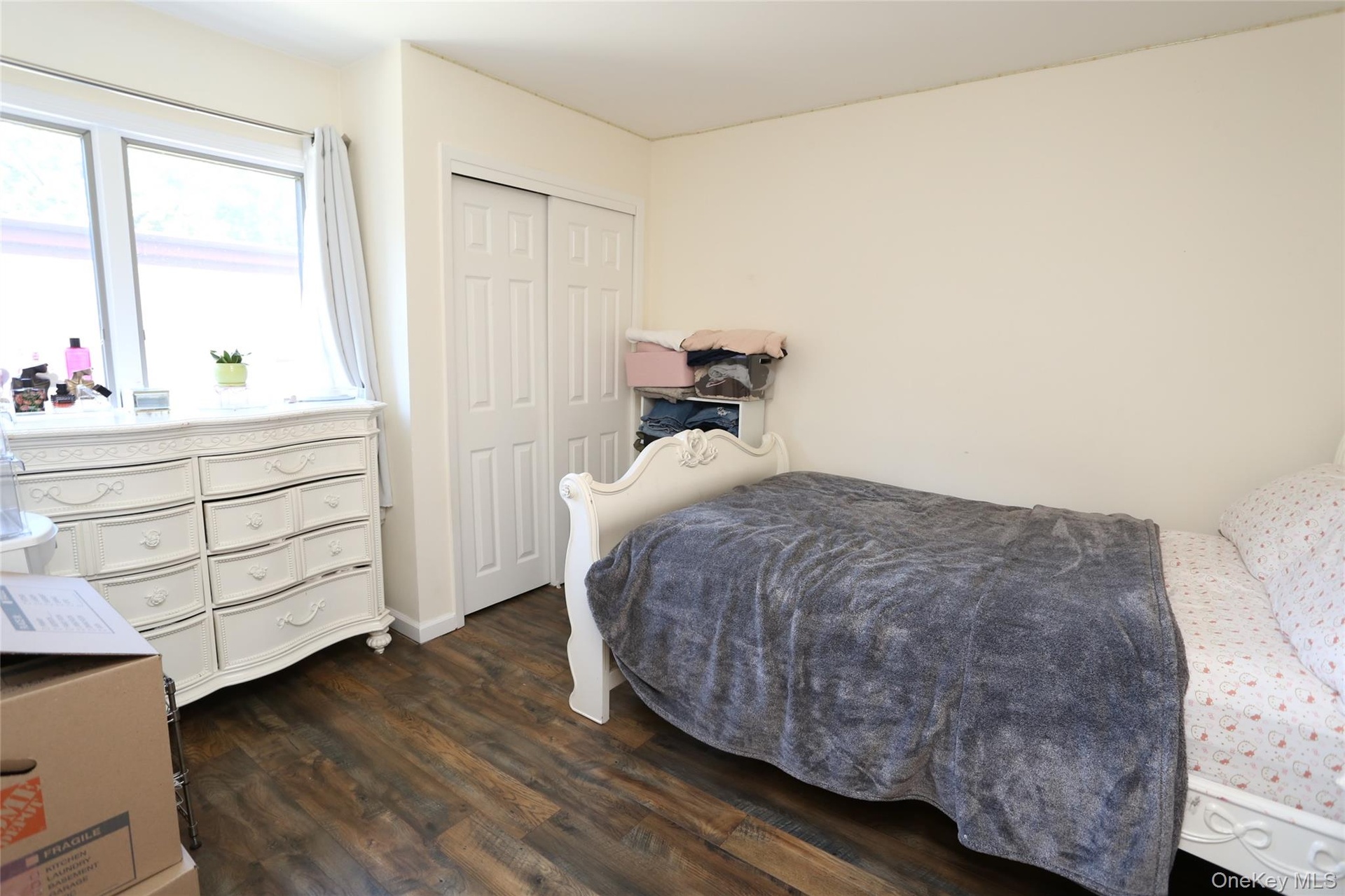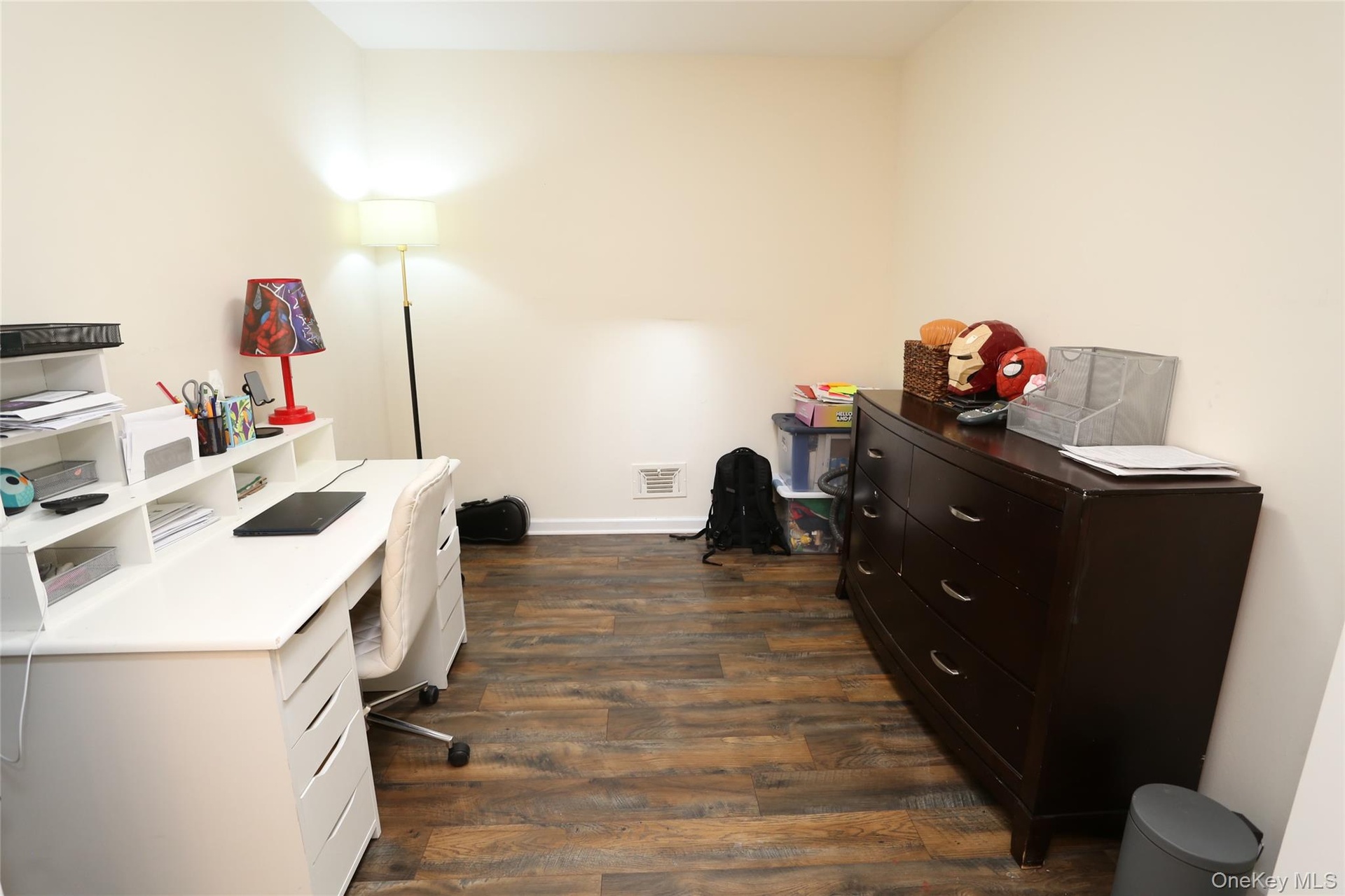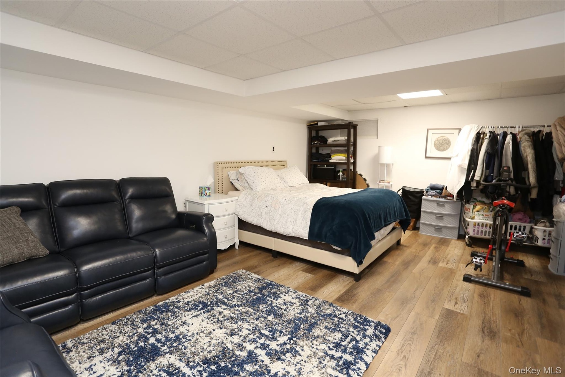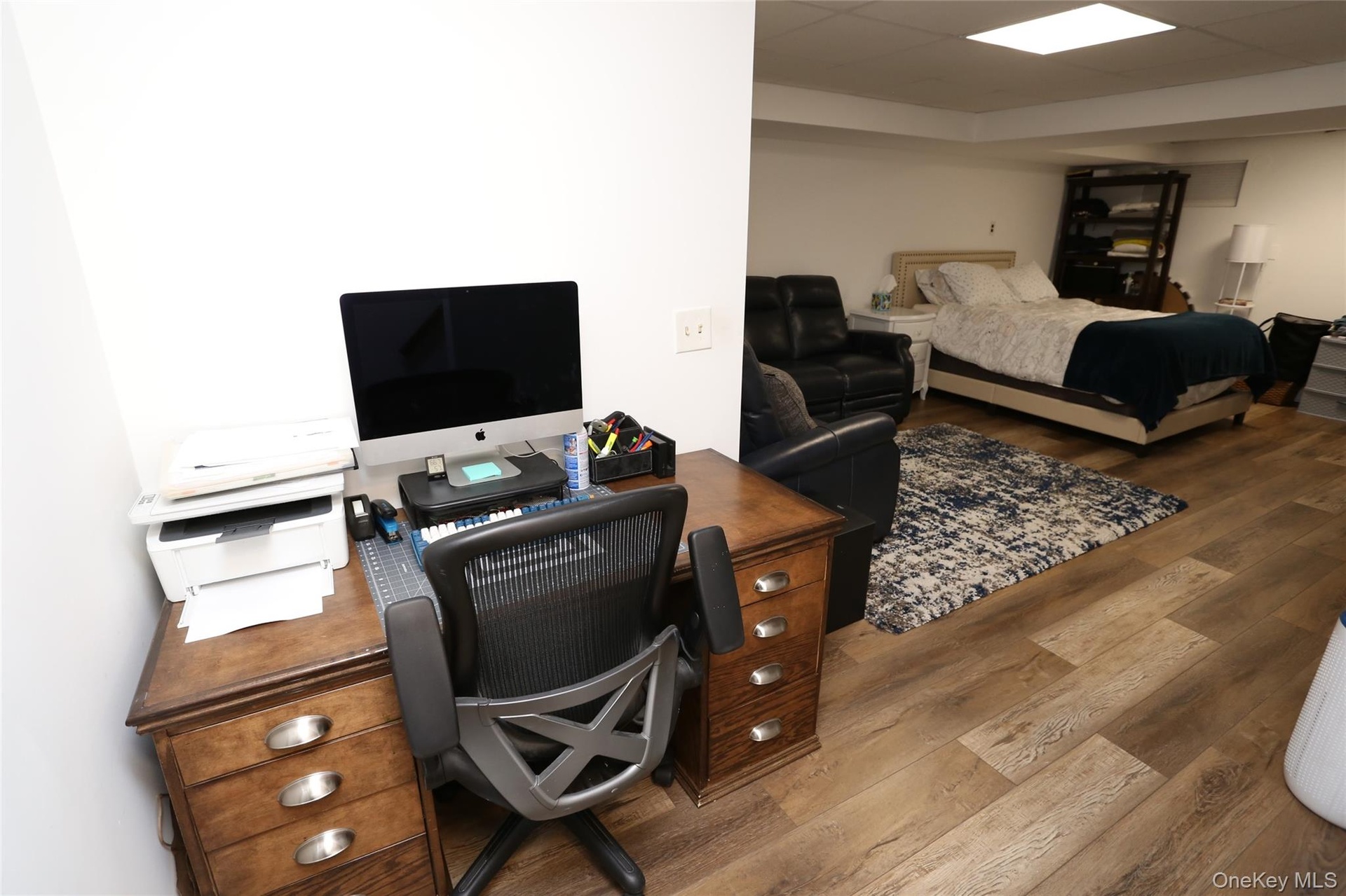 - Bedroom featuring an office area, wood finished floors, and a drop ceiling