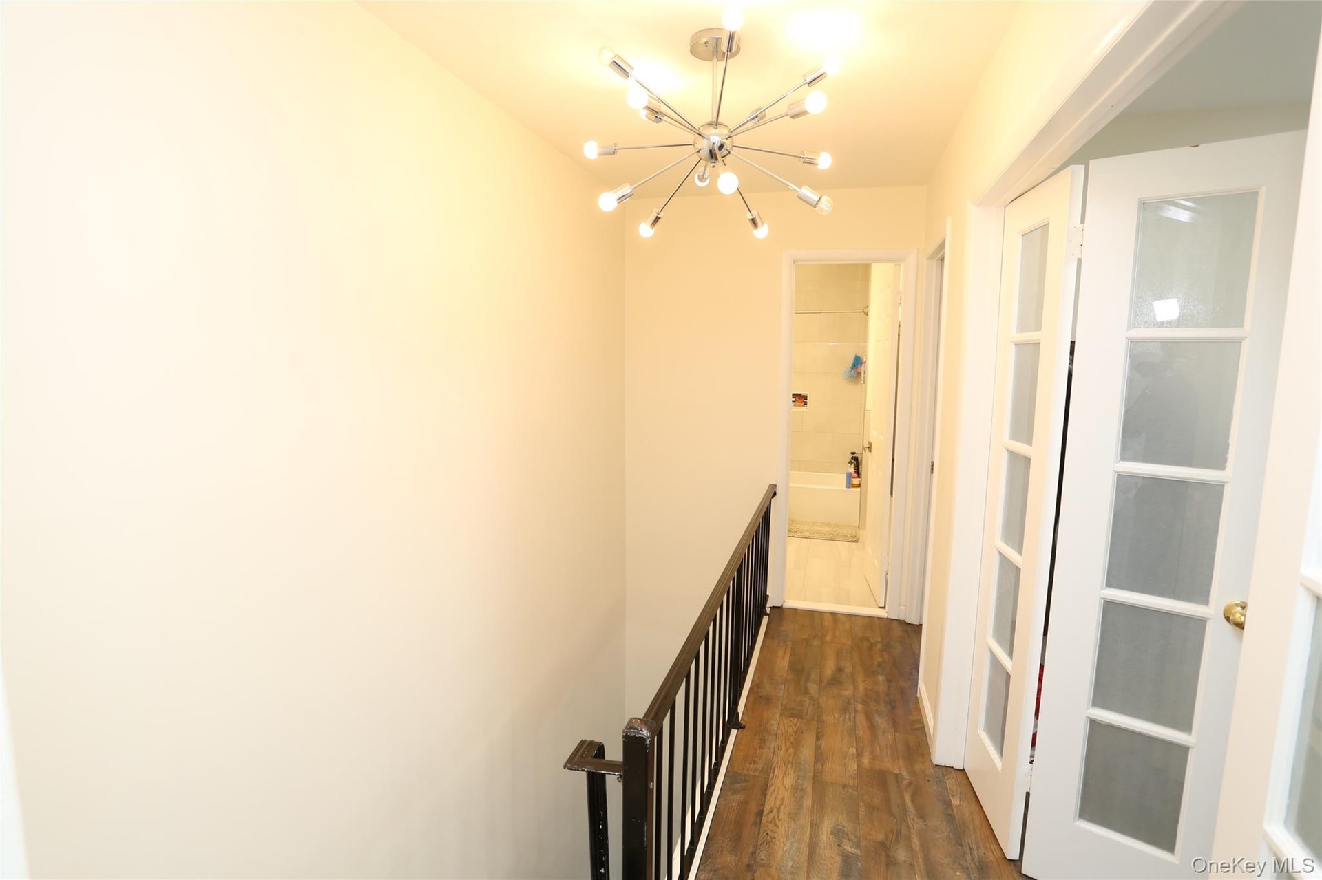 - Hallway featuring an upstairs landing, dark wood-style floors, and a chandelier