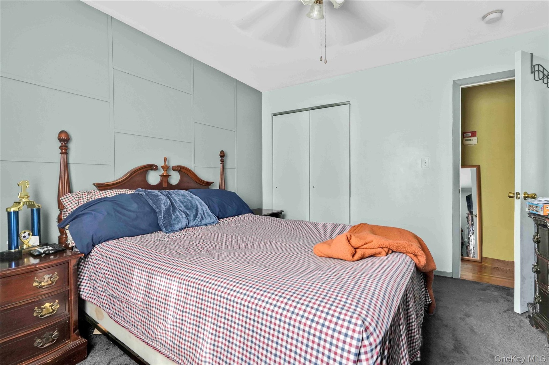 - Carpeted bedroom featuring a closet and a ceiling fan