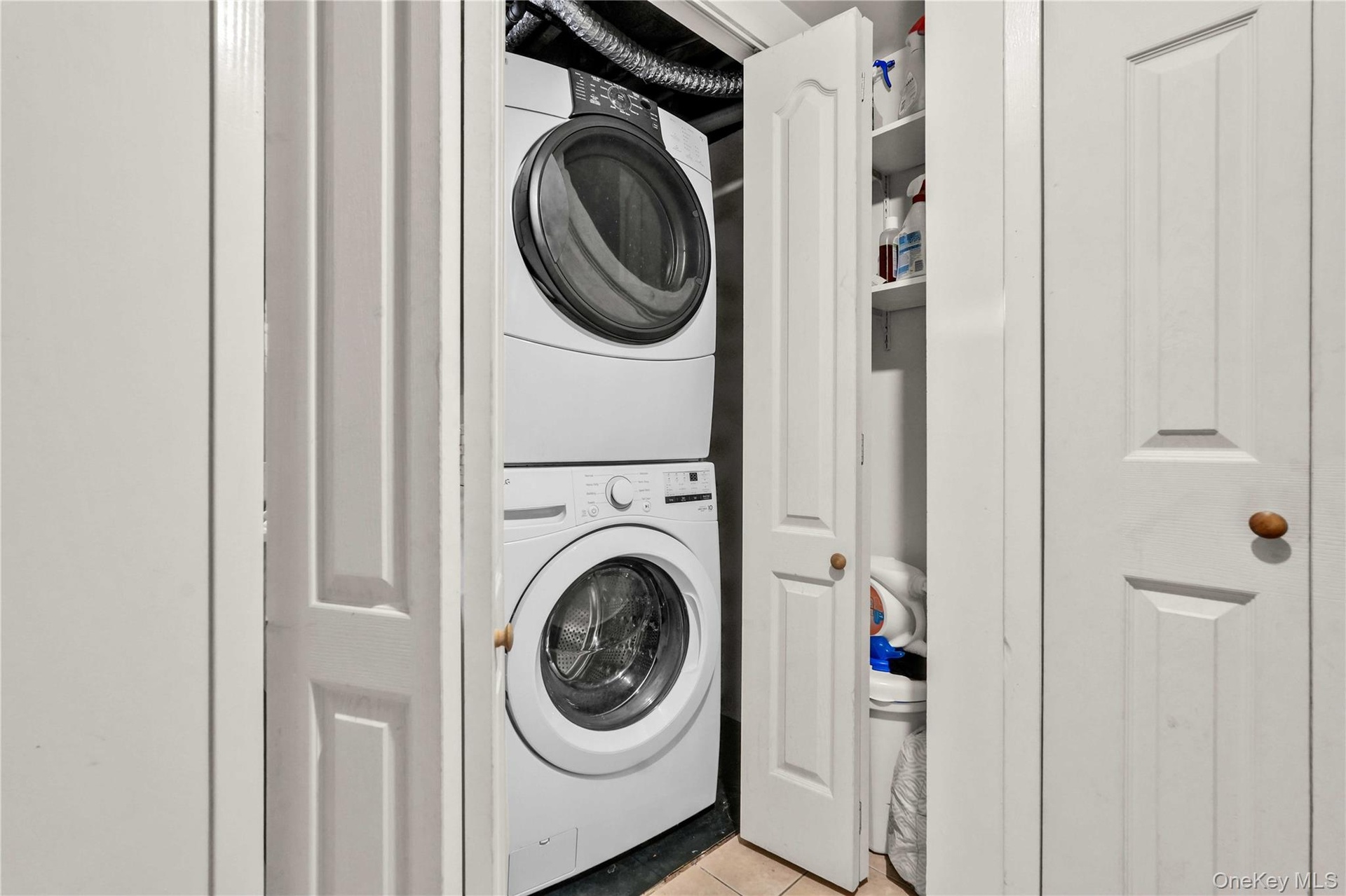 - Laundry room with light tile patterned floors and estacked washer and dryer