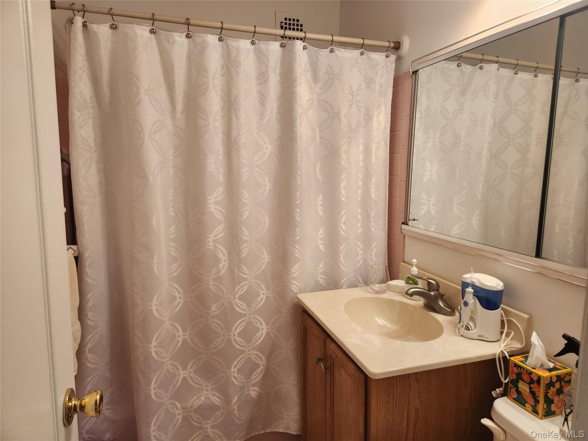 - Full bathroom with vanity and a shower with shower curtain