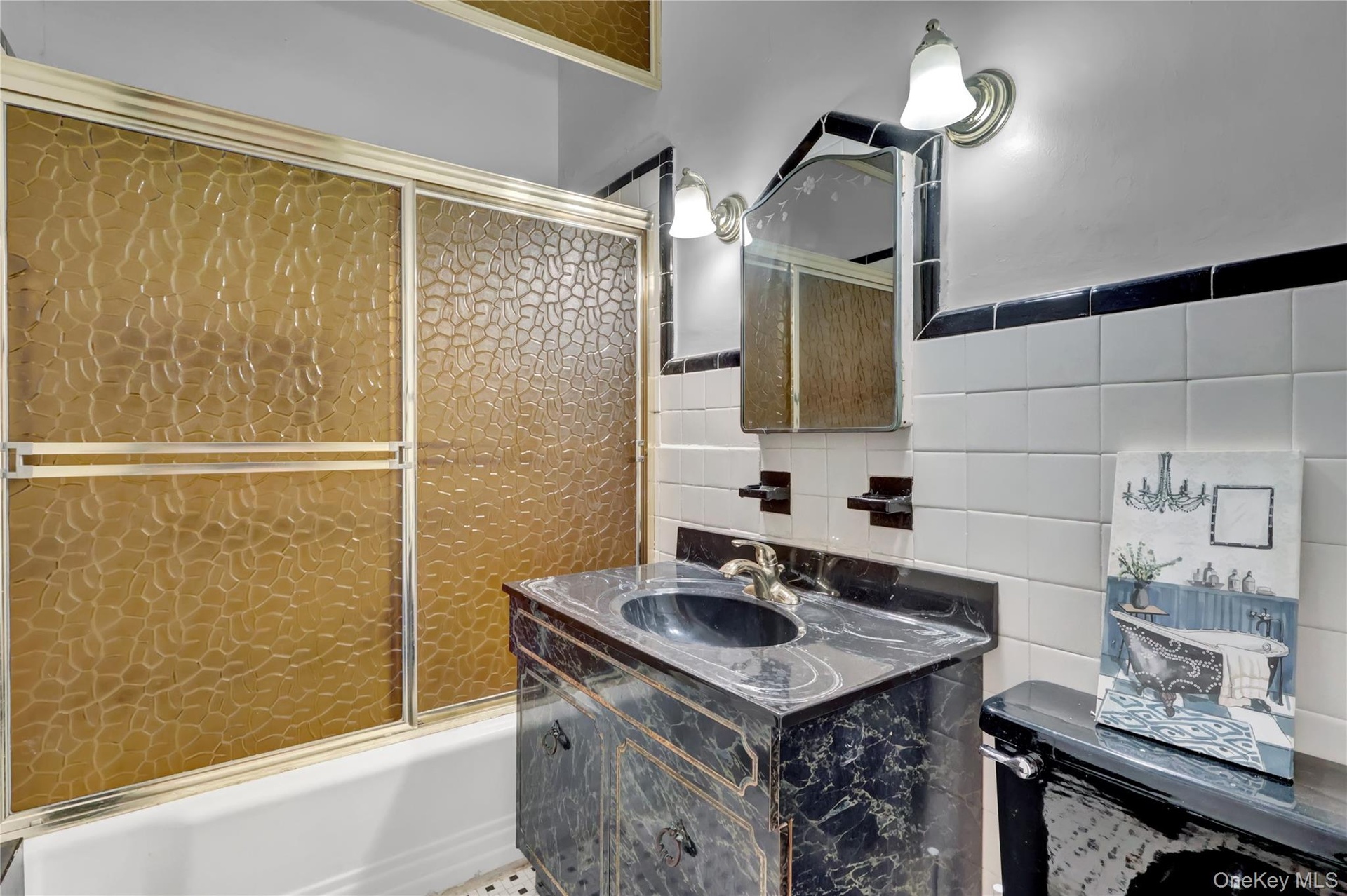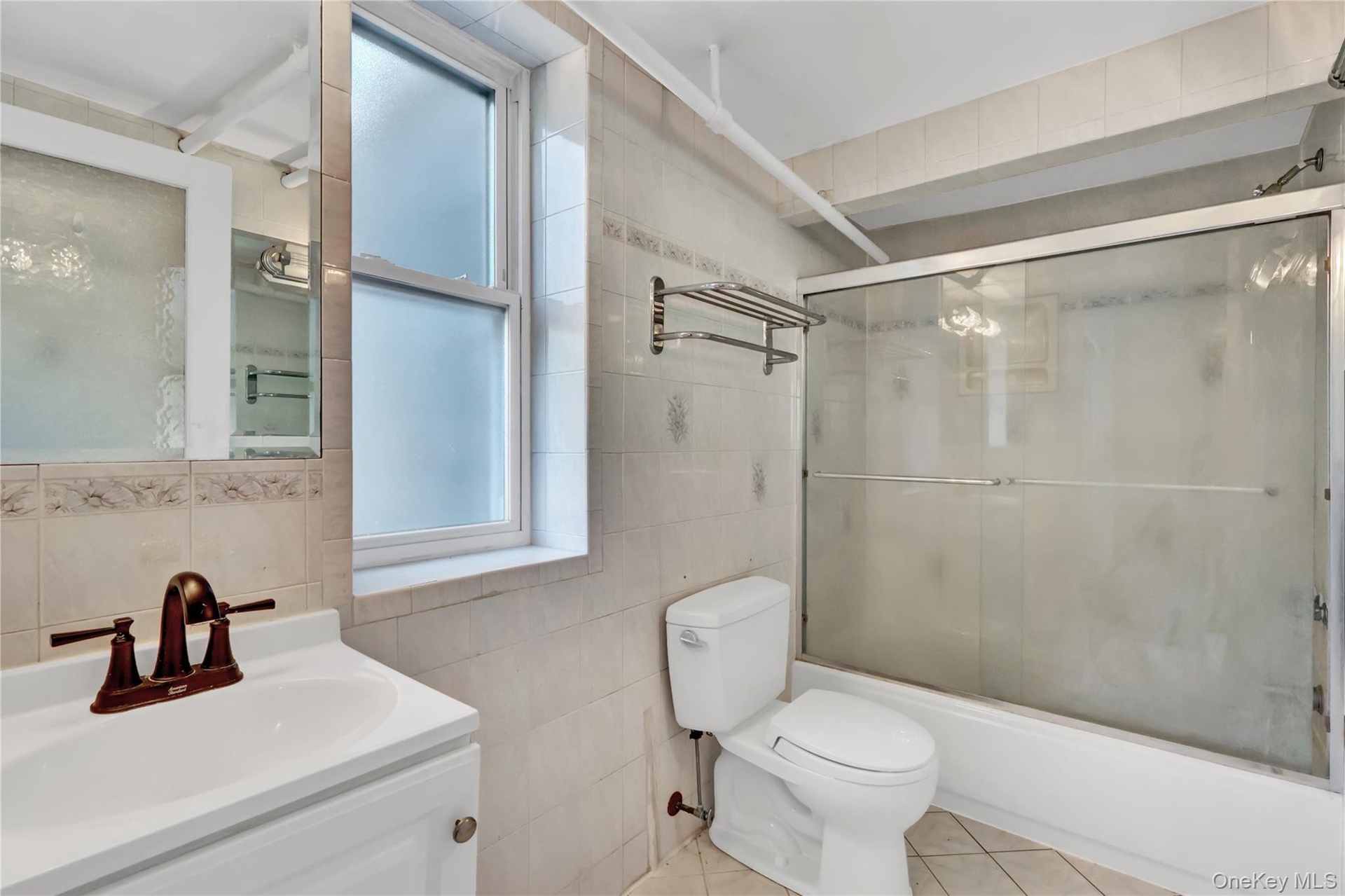 - Bathroom with combined bath / shower with glass door, tile walls, vanity, and tile patterned flooring