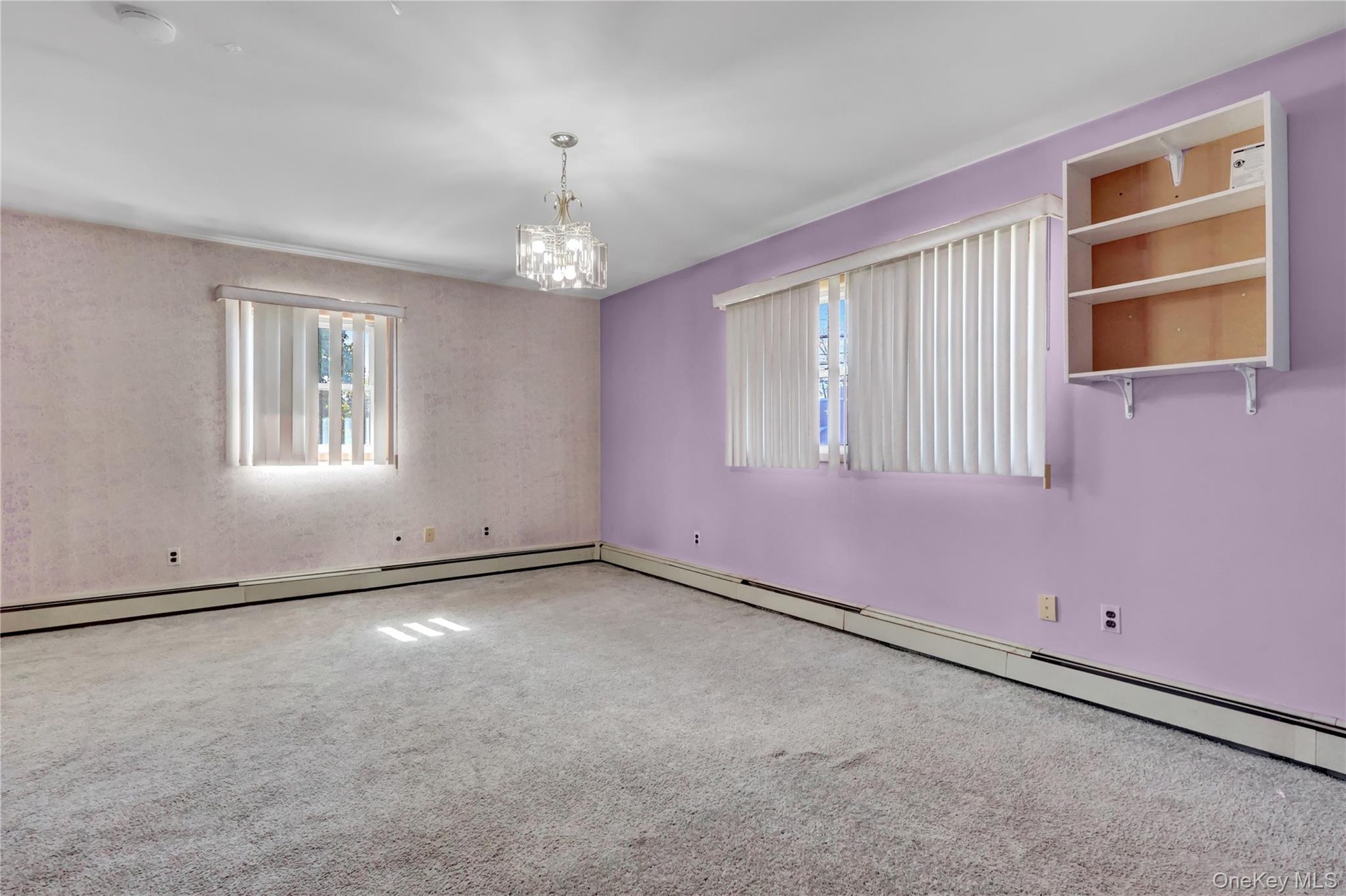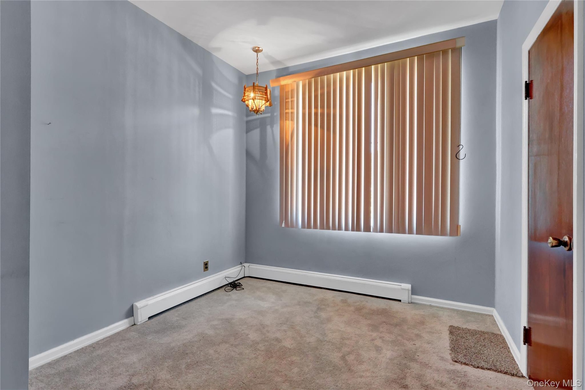 - Spare room with a chandelier, carpet flooring, and a baseboard radiator