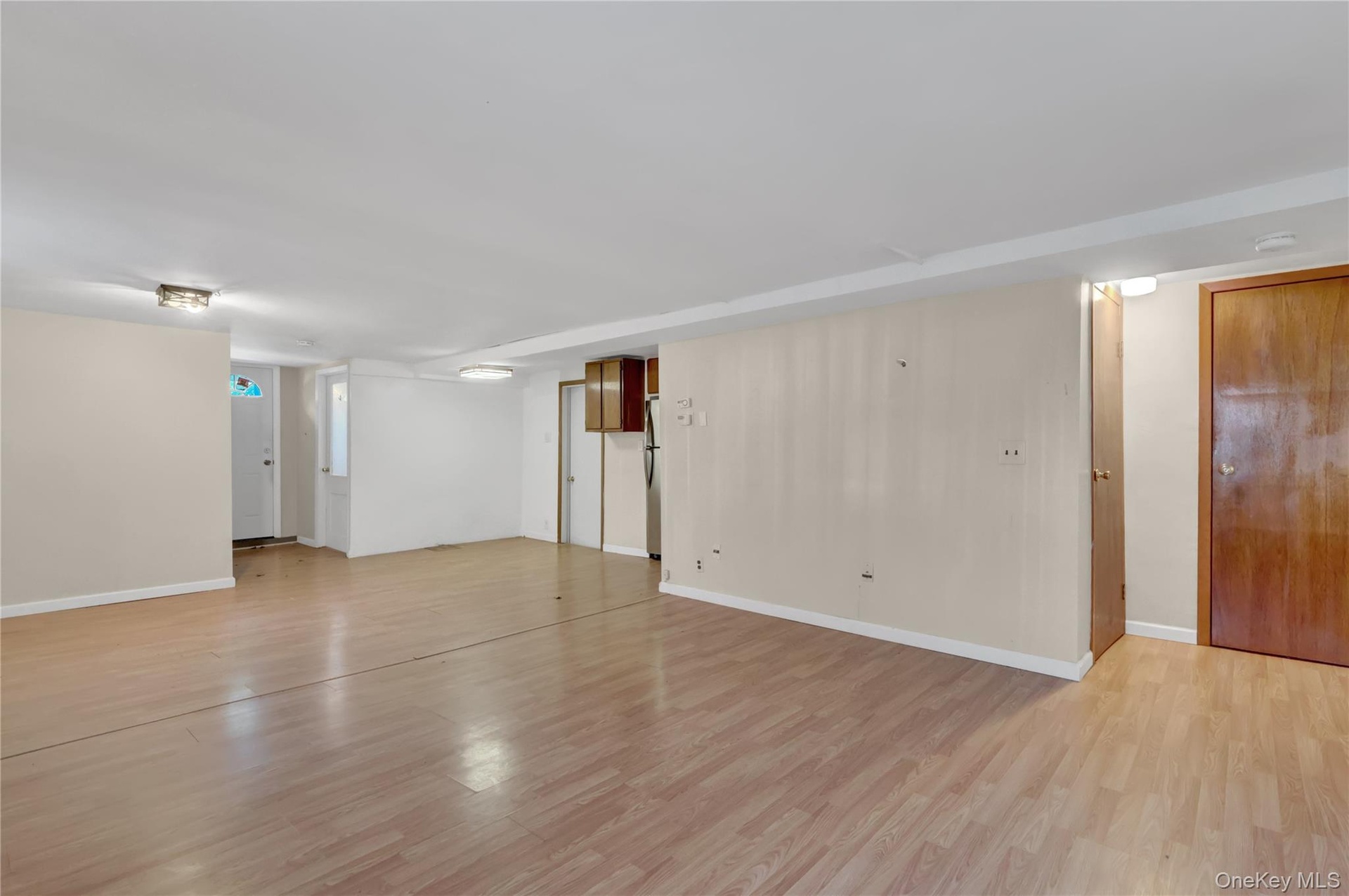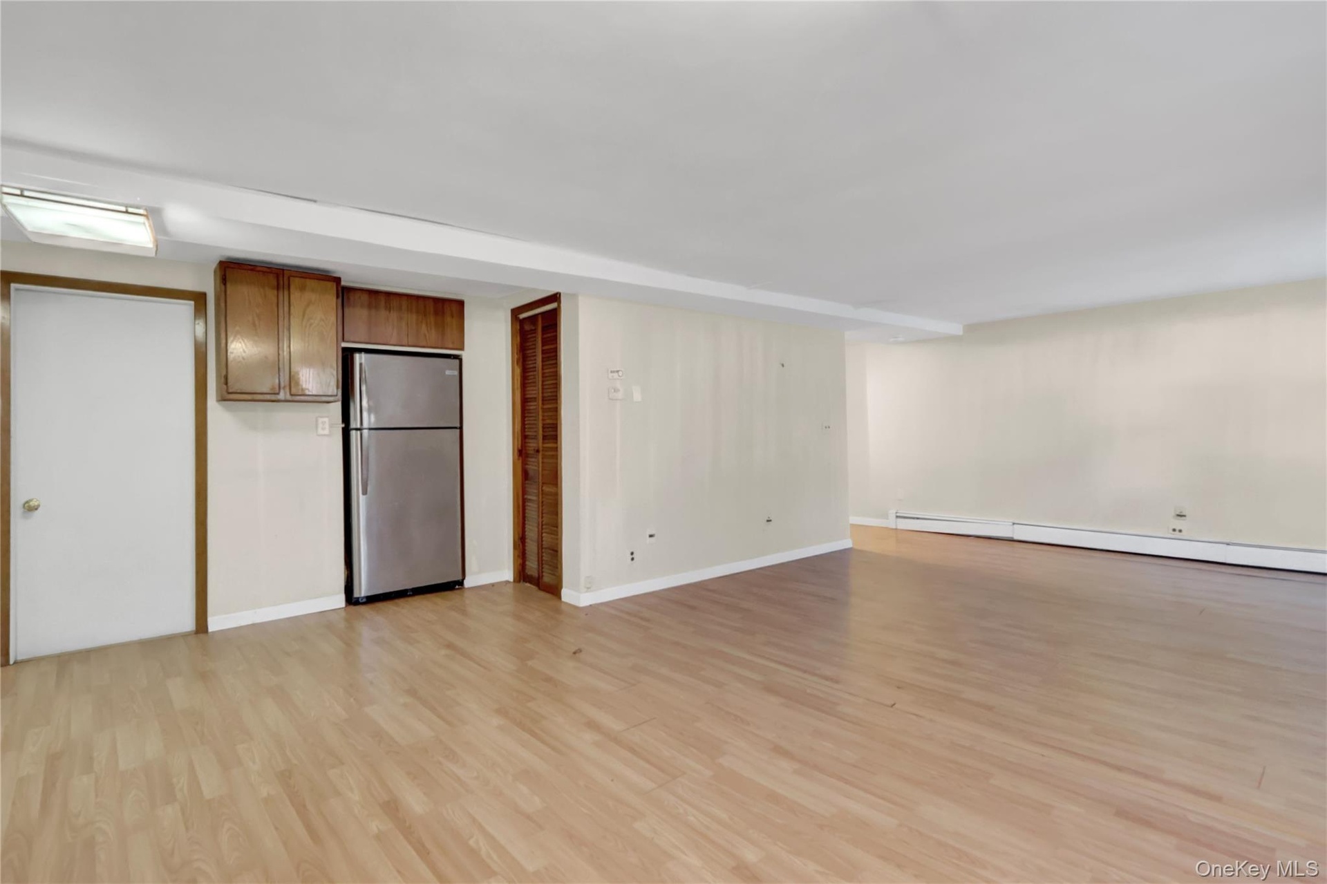 - Unfurnished living room featuring light wood-style flooring and a baseboard heating unit