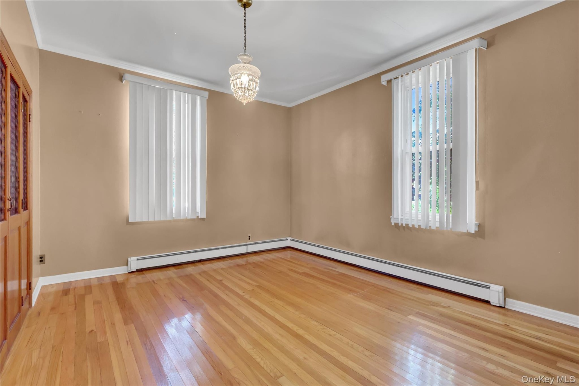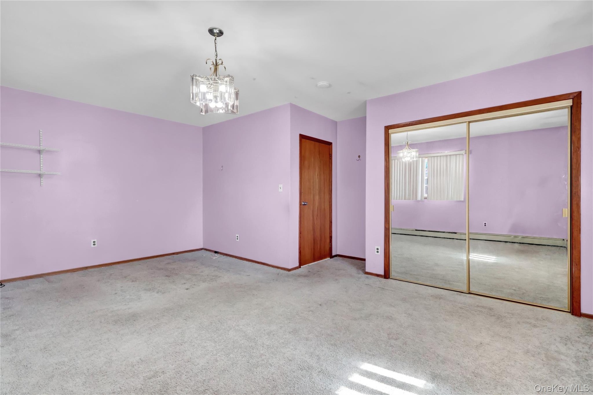 - Unfurnished bedroom with a chandelier, carpet, a closet, and a baseboard radiator