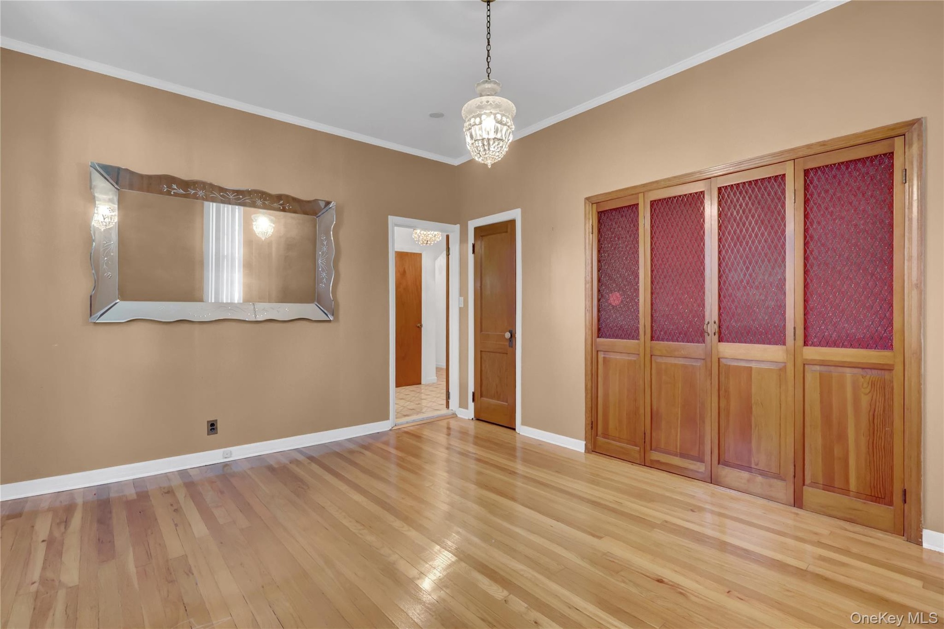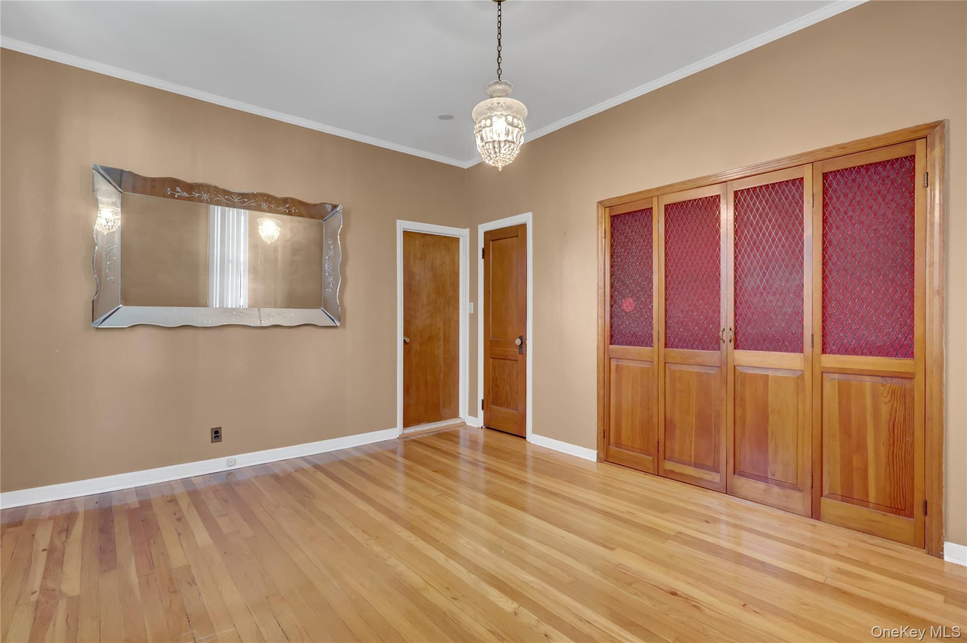 - Unfurnished bedroom with ornamental molding, wood-type flooring, a closet, and a chandelier