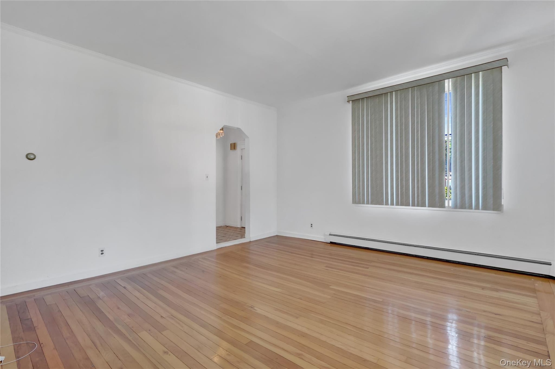 - Empty room with hardwood / wood-style flooring, arched walkways, and baseboard heating