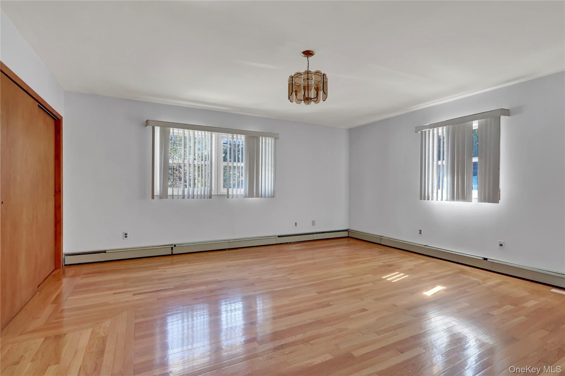 - Empty room with a baseboard heating unit, light wood finished floors, and a chandelier
