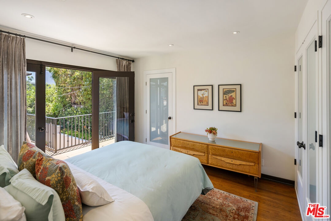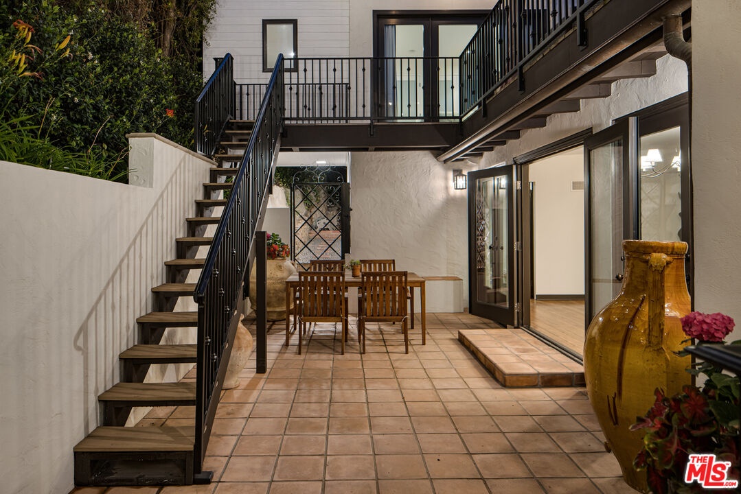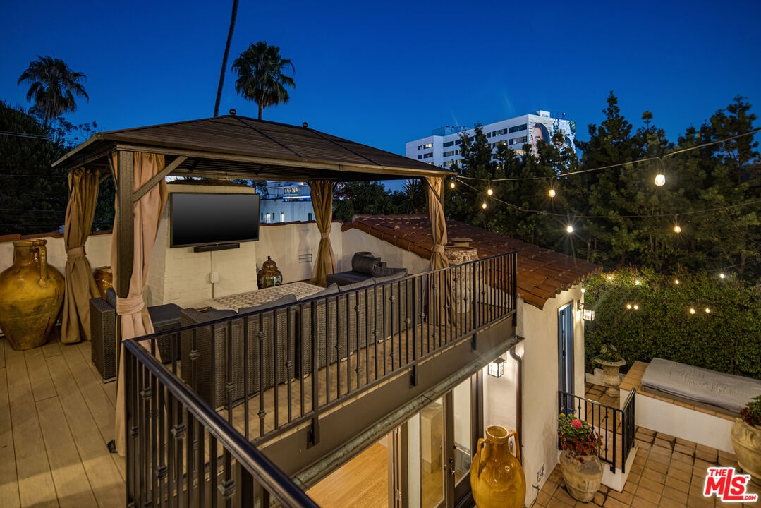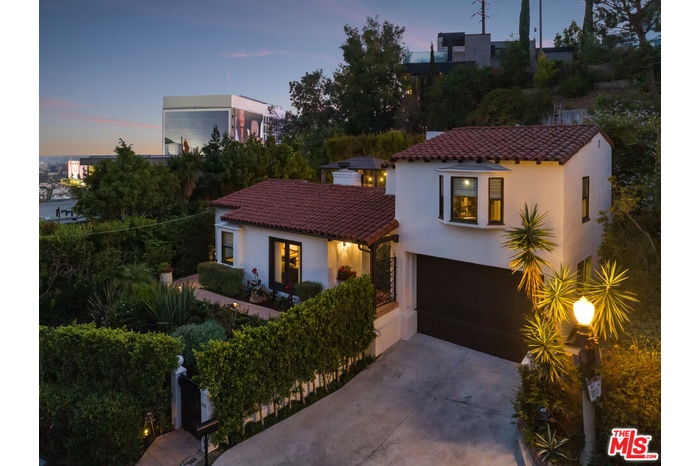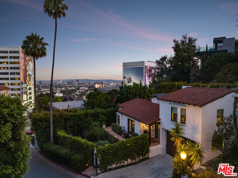 In a colorful garden setting just a few doors above Sunset, this vintage 2-story Spanish Revival home is ideally located in the heart of the Strip, close to many great dining establishments, upscale hotels, the Sunset Plaza shopping district, and West Hollywood's most happening nightlife. As you approach the gated home, you'll be charmed by the lush, vibrant landscaping. Enter through the original paneled front door and be welcomed by the arched walls, warm oak floors, and coved plaster ceilings laid out in a classic floor plan that incorporates large private patios on both the first and second levels; it's a California lifestyle classic. Many French doors bring great light into the interiors, and the original fireplace imbues the home with a warm, classic ambiance. The dining room, perfect for dinner parties, opens to a very private courtyard through a wall of glass doors. A previous renovation transformed the garage into a spacious primary suite, complete with a built-in wall of wardrobe cabinets and a beautiful white marble bathroom. Upstairs is a second white mosaic marble bathroom with tub and shower, and two more bedrooms; both are light-filled, one with two large closets and French doors that open to a patio that features a covered gazebo with TV entertainment system. Enjoy the glamor and excitement of the iconic Sunset Strip while living in a light-filled classic home in a private green garden; complete privacy just moments away from great experiences.