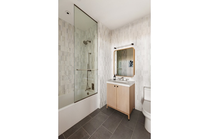The king-sized primary suite features unobstructed views over the City skyline and the East River and features a large walk-in closet as well as a luxurious, five-fixture en-suite bath. The primary bath is outfitted with radiant heated marble floors, custom Waterworks fixtures, a large double vanity with drawer and medicine cabinet storage, and deep soaking tub and spacious rain shower. The 2nd bedroom faces West, with serene sunset views over the Harbor and enough space for a king-sized bed if desired.