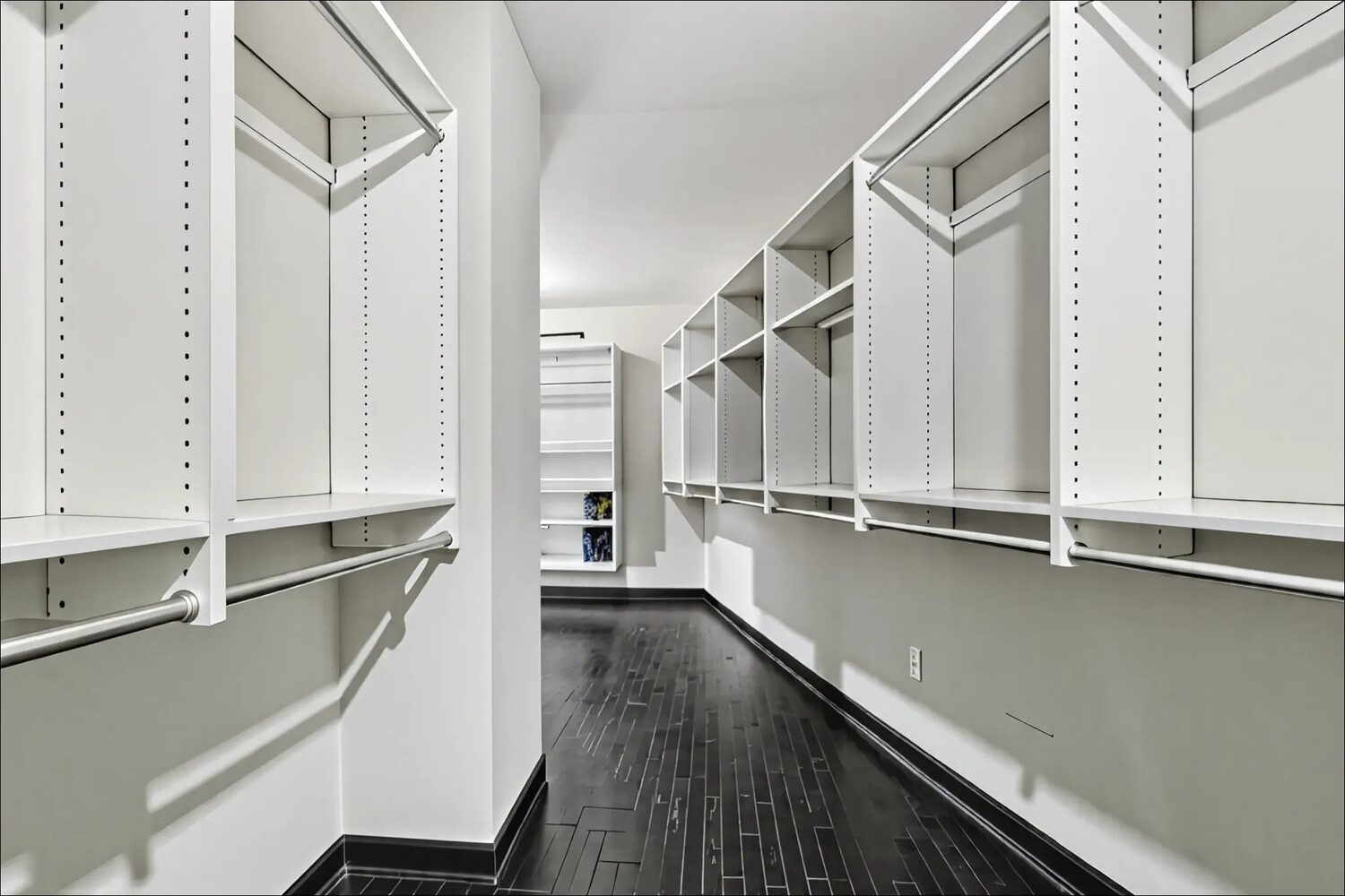 The primary bedroom is generously proportioned, large enough to accommodate a separate seating area or home office. Adjacent to the bedroom is a vast dressing room, ideal for storage and organization. With northeast exposures, the space is flooded with natural light. The spa-like en-suite bathroom showcases marble tiling, a glass-enclosed rainfall shower, and a wide vanity with ample storage. An additional powder room with in-unit washer/dryer adds convenience.