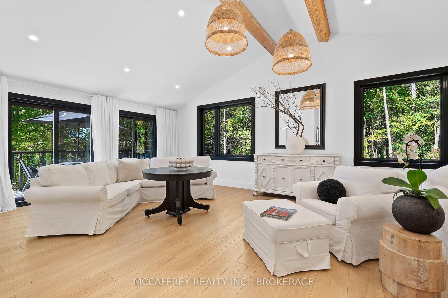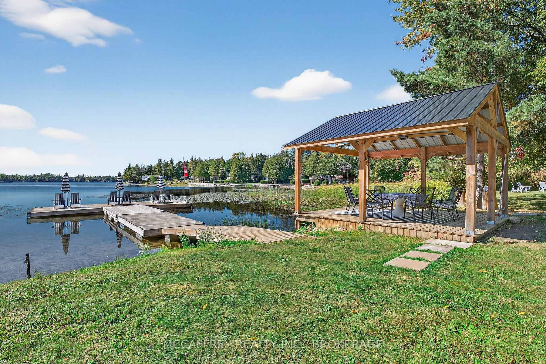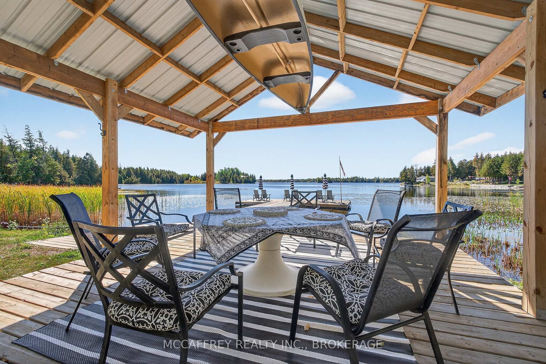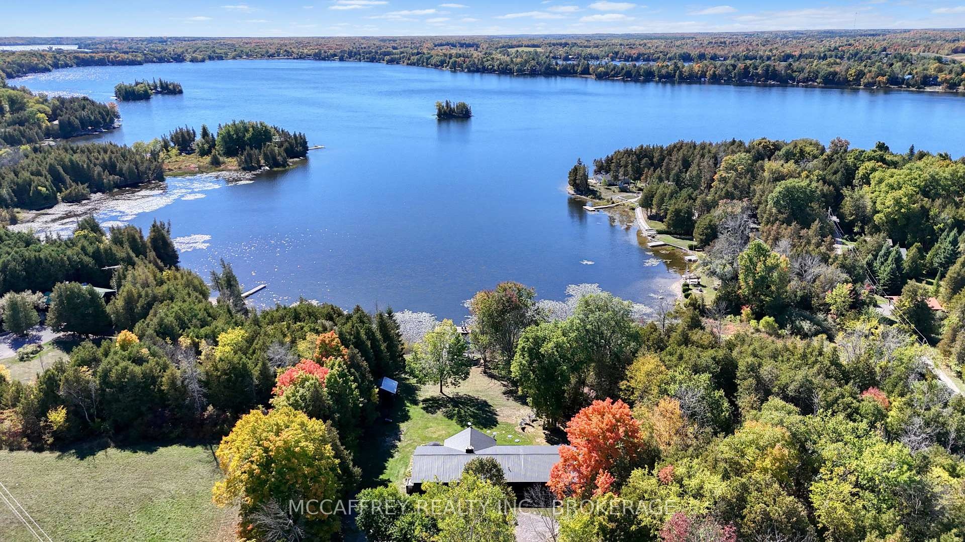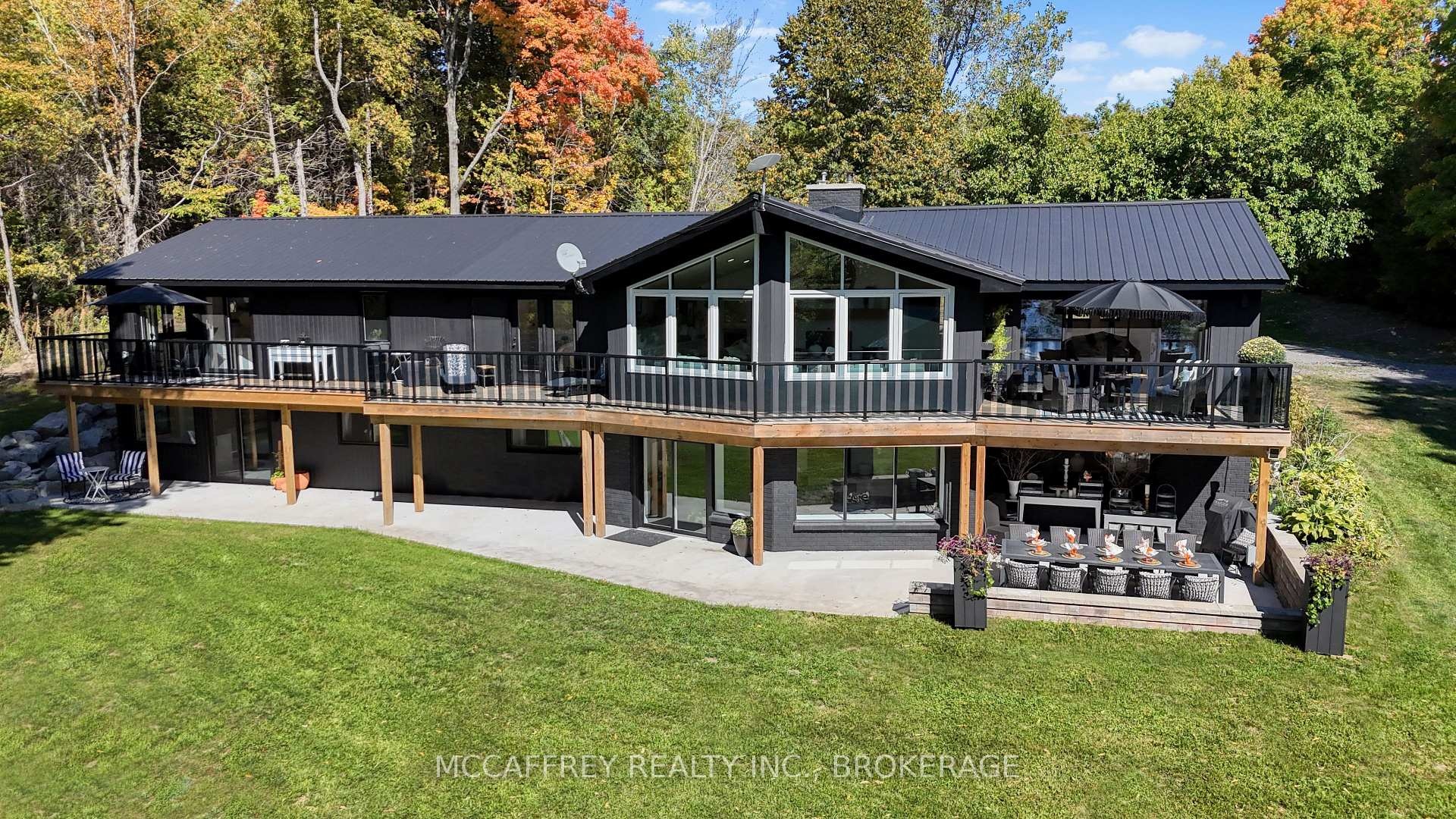 Welcome to your private lakefront sanctuary - where elegance, scale, and serenity meet. Set on 3.8 acres of wooded privacy and boasting an impressive 259 feet of natural Beaver Lake shoreline, this extraordinary retreat offers over 5,000 square feet of finely renovated living space. Tucked into a tranquil bay, you'll enjoy peaceful waters free from heavy boat traffic, all while being part of a warm, welcoming community. A long circular driveway makes a grand approach, leading you to the homes timeless exterior and detached heated garage. Step inside and feel the airiness of soaring 12-foot cathedral ceilings, expansive windows, and wide-plank floors that capture every angle of the lake. The open living space blends comfort and sophistication, anchored by a cozy wood burning fireplace and panoramic water views. The chefs kitchen is a showpiece in itself, featuring a quartz waterfall island, built-in appliances, and seamless flow into the dining area. Open the 12-foot glass wall to step onto the deck -perfect for morning coffee among the trees or golden sunsets over the lake. With 6 bedrooms and 5 bathrooms, this home was designed for hosting family and guests in total comfort. The main-floor primary suite is a private retreat with a spa-inspired ensuite, soaker Jacuzzi, glass shower, and walkout to its own deck. Additional bedrooms, including a secondary ensuite, provide ample space for visitors. The walkout lower level expands the living space with a bright recreation room, office, second laundry, four additional bedrooms, a full bath, and generous storage. Step outside to your private waterfront oasis: a T-shaped dock for swimming and boating, a gazebo for shady afternoons, and a charming bunkie for weekend guests. This is more than a home - its an elevated lifestyle. Privacy, scale, modern design, and natural beauty come together in perfect harmony.