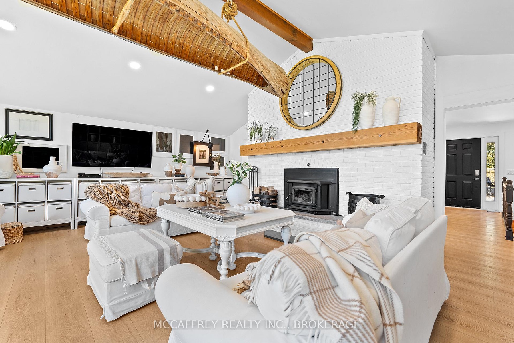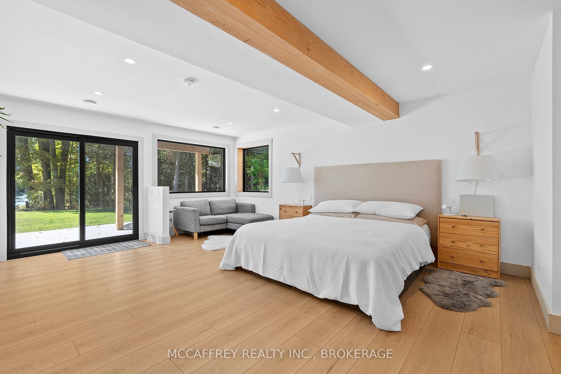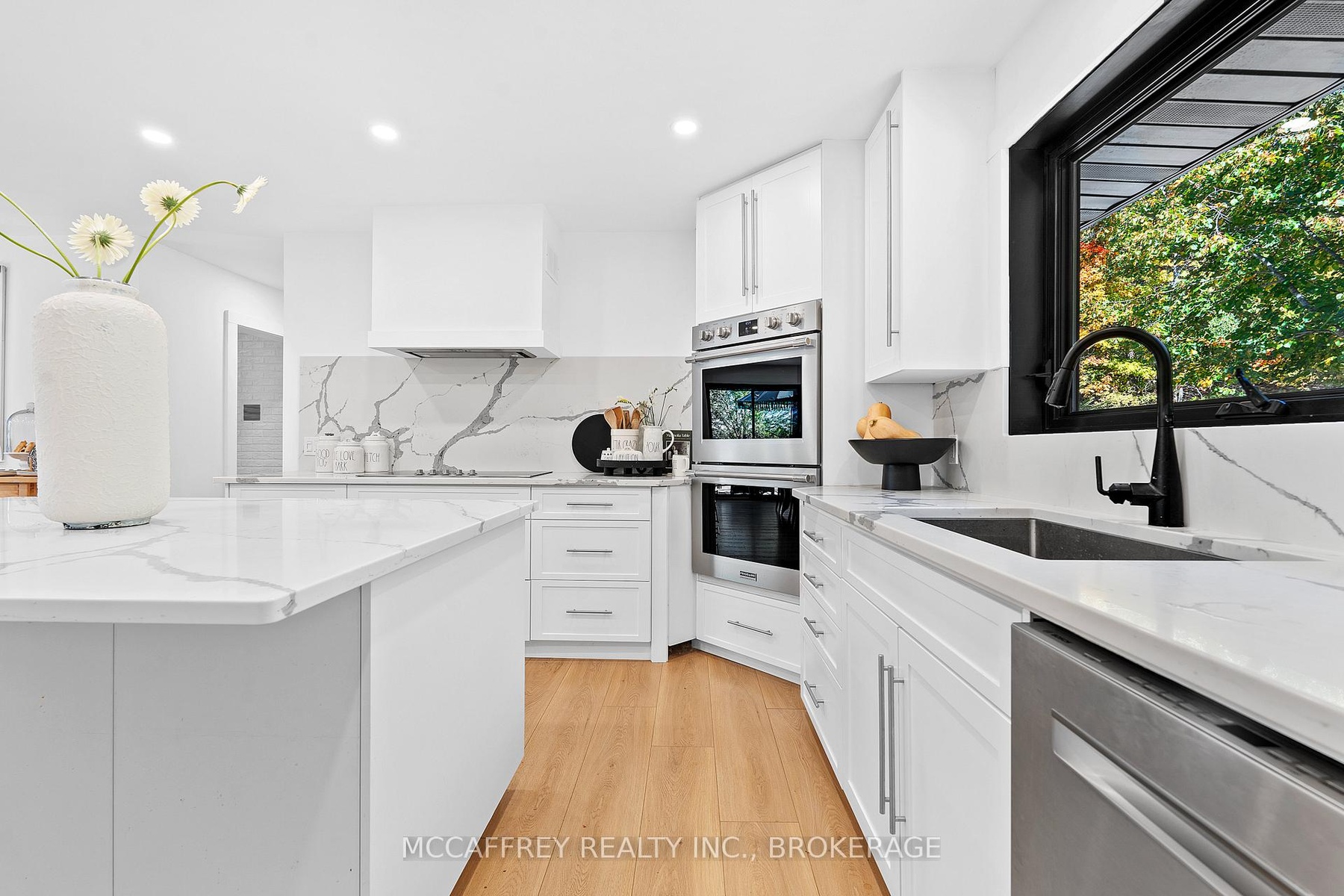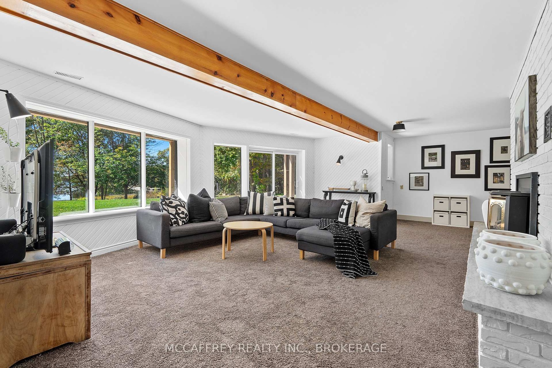 Welcome to your private lakefront sanctuary - where elegance, scale, and serenity meet. Set on 3.8 acres of wooded privacy and boasting an impressive 259 feet of natural Beaver Lake shoreline, this extraordinary retreat offers over 5,000 square feet of finely renovated living space. Tucked into a tranquil bay, you'll enjoy peaceful waters free from heavy boat traffic, all while being part of a warm, welcoming community. A long circular driveway makes a grand approach, leading you to the homes timeless exterior and detached heated garage. Step inside and feel the airiness of soaring 12-foot cathedral ceilings, expansive windows, and wide-plank floors that capture every angle of the lake. The open living space blends comfort and sophistication, anchored by a cozy wood burning fireplace and panoramic water views. The chefs kitchen is a showpiece in itself, featuring a quartz waterfall island, built-in appliances, and seamless flow into the dining area. Open the 12-foot glass wall to step onto the deck -perfect for morning coffee among the trees or golden sunsets over the lake. With 6 bedrooms and 5 bathrooms, this home was designed for hosting family and guests in total comfort. The main-floor primary suite is a private retreat with a spa-inspired ensuite, soaker Jacuzzi, glass shower, and walkout to its own deck. Additional bedrooms, including a secondary ensuite, provide ample space for visitors. The walkout lower level expands the living space with a bright recreation room, office, second laundry, four additional bedrooms, a full bath, and generous storage. Step outside to your private waterfront oasis: a T-shaped dock for swimming and boating, a gazebo for shady afternoons, and a charming bunkie for weekend guests. This is more than a home - its an elevated lifestyle. Privacy, scale, modern design, and natural beauty come together in perfect harmony.