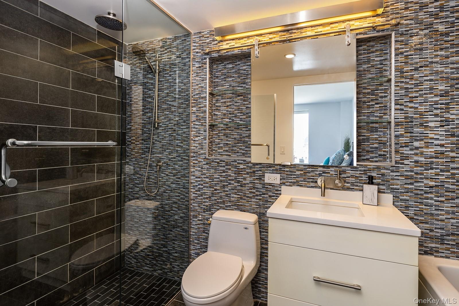 - Bathroom with a combined bath / shower with rainfall shower, tile walls, vanity, decorative backsplash, and recessed lighting