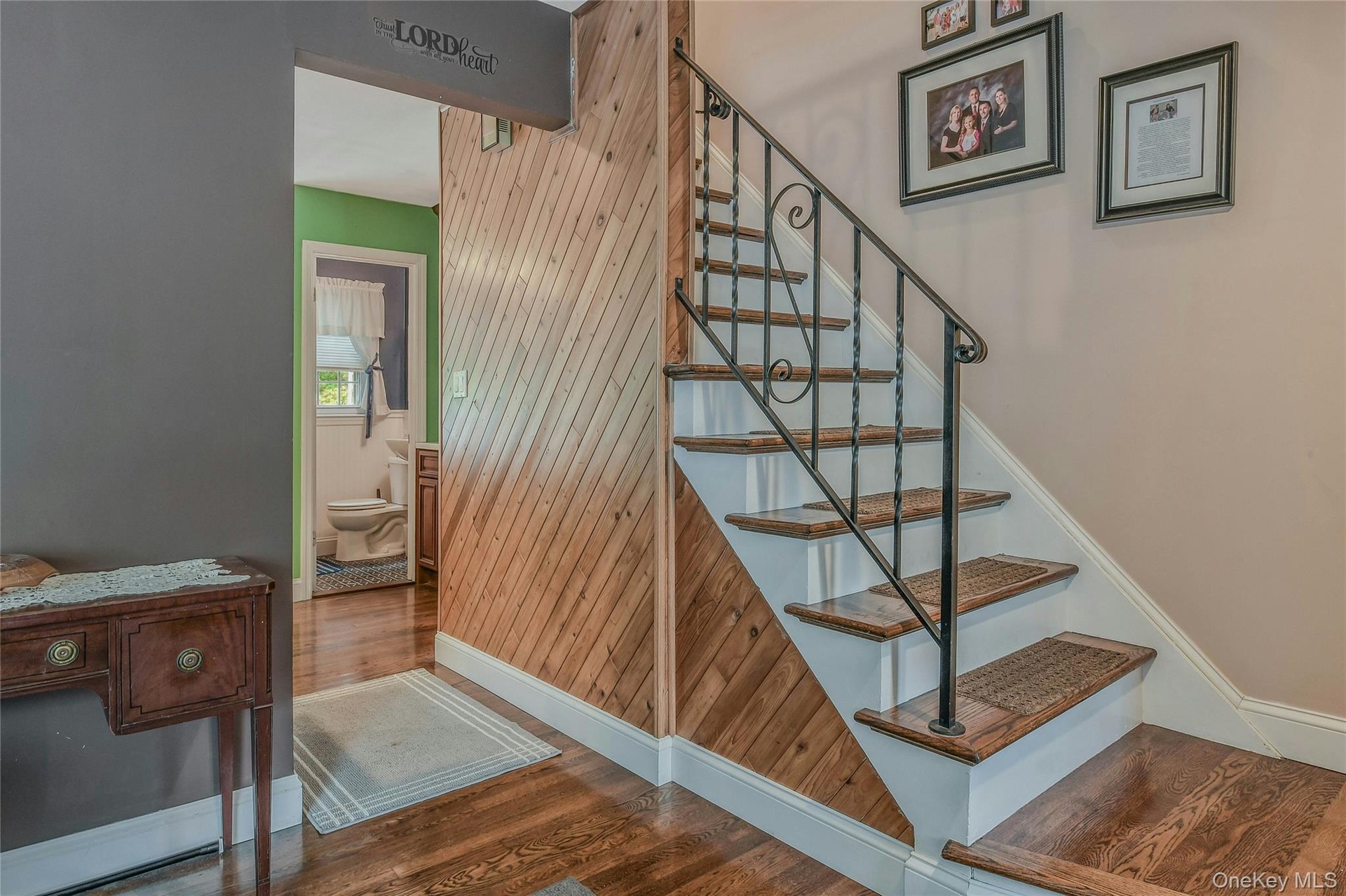 - Staircase featuring wood finished floors and wooden walls