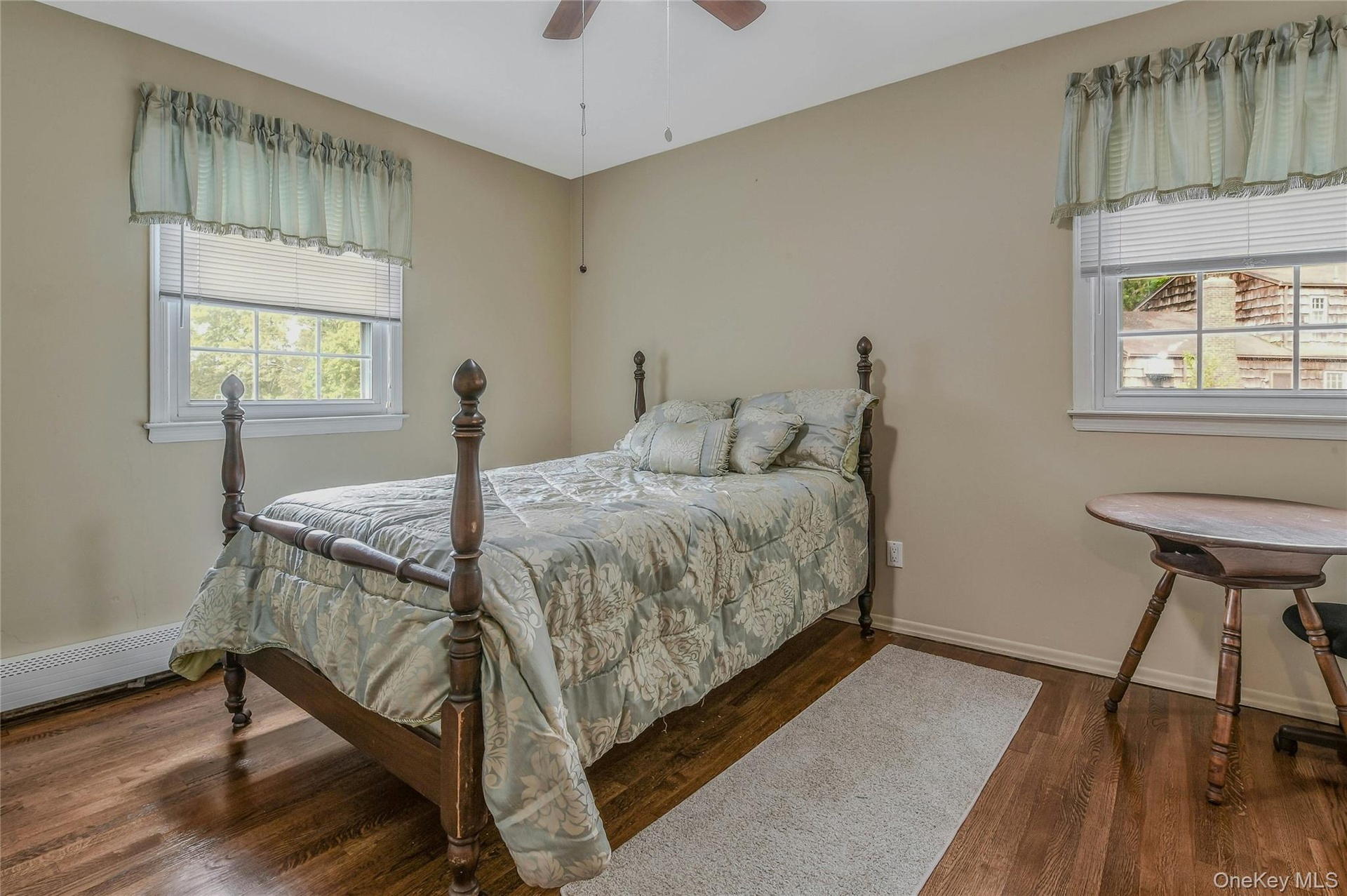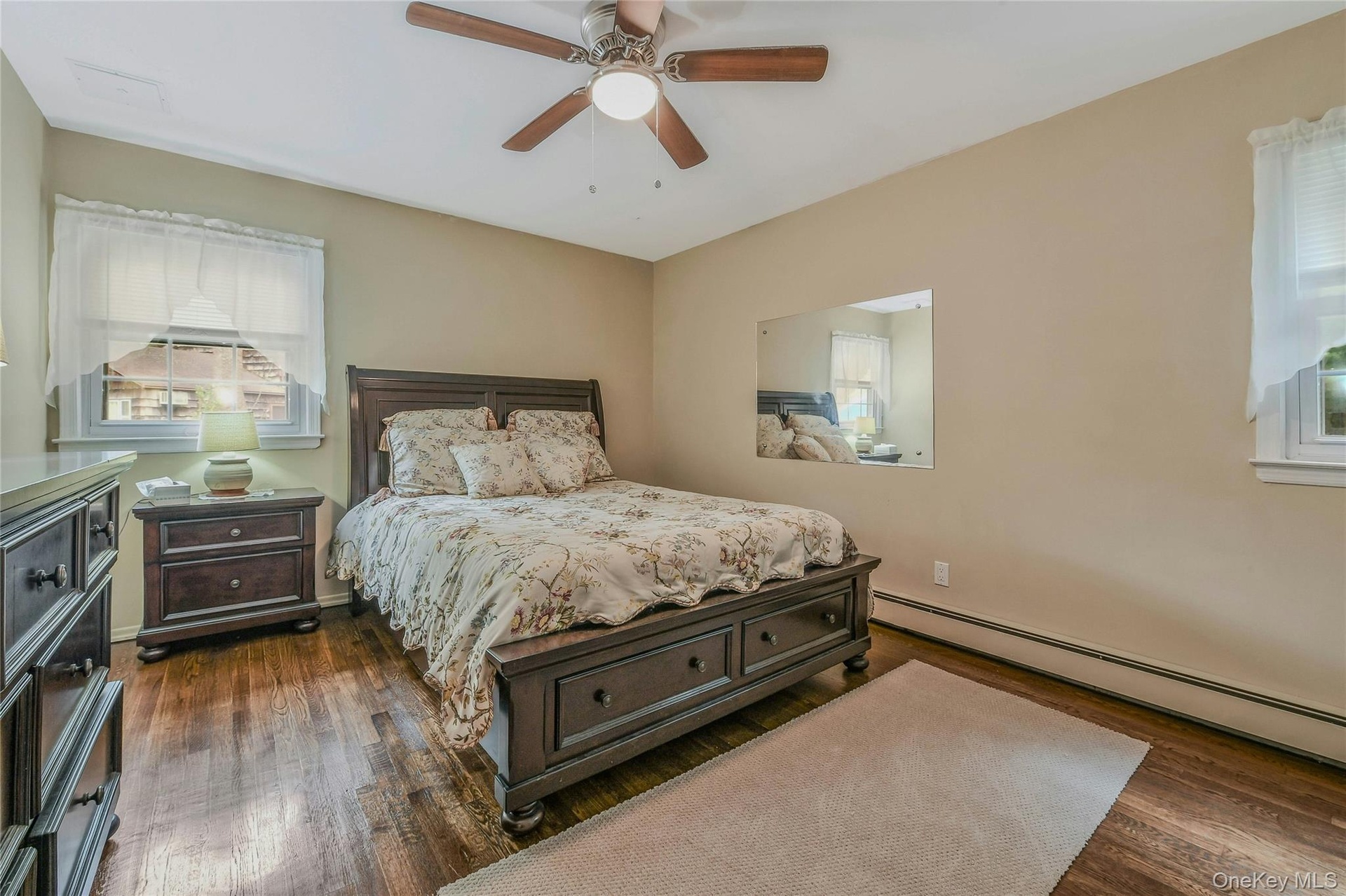 - Bedroom with dark wood-style floors, ceiling fan, and a baseboard radiator