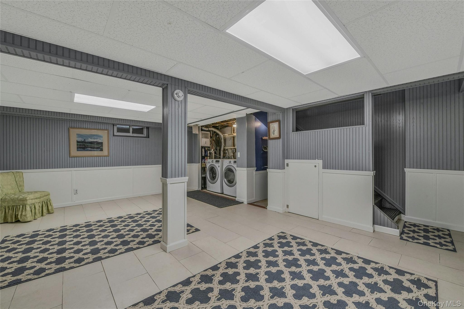 - Finished below grade area featuring a drop ceiling, tile patterned floors, washer and clothes dryer, and a wainscoted wall