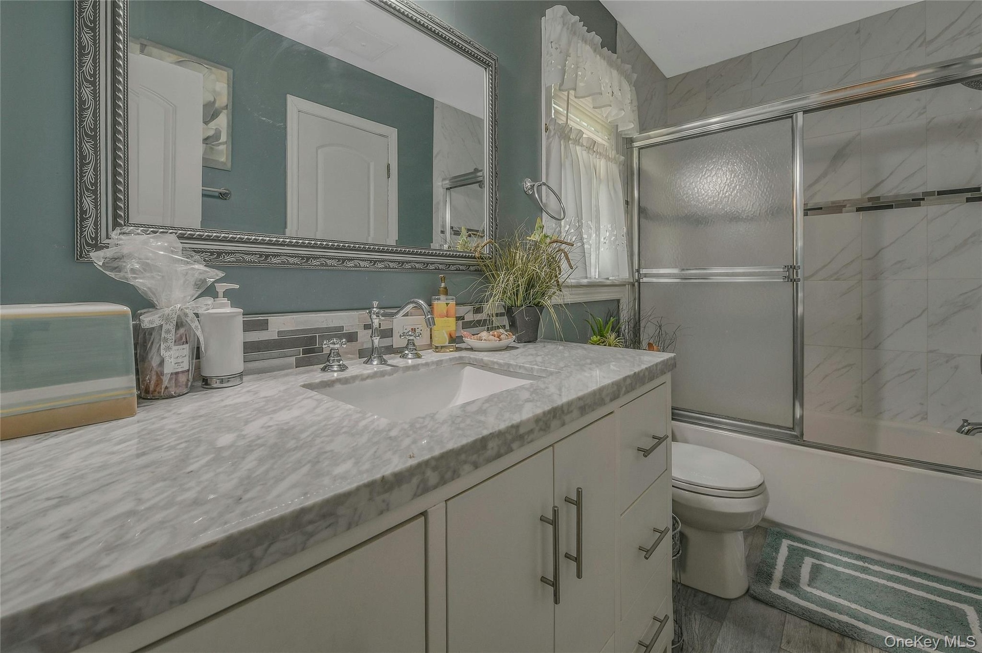 - Full bathroom with vanity, enclosed tub / shower combo, wood finished floors, and decorative backsplash