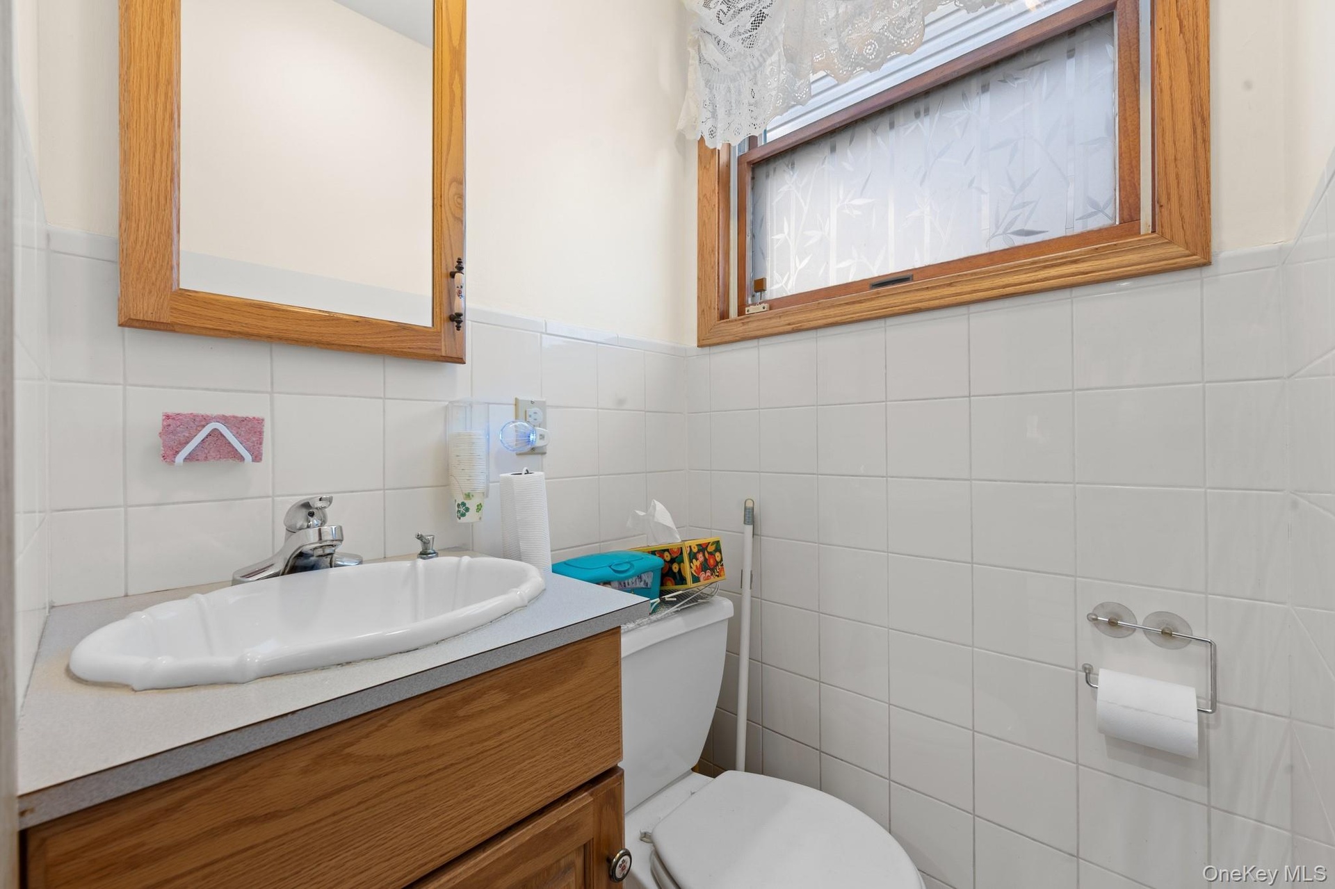 - Bathroom with tile walls, shower / tub combo, vanity, and backsplash