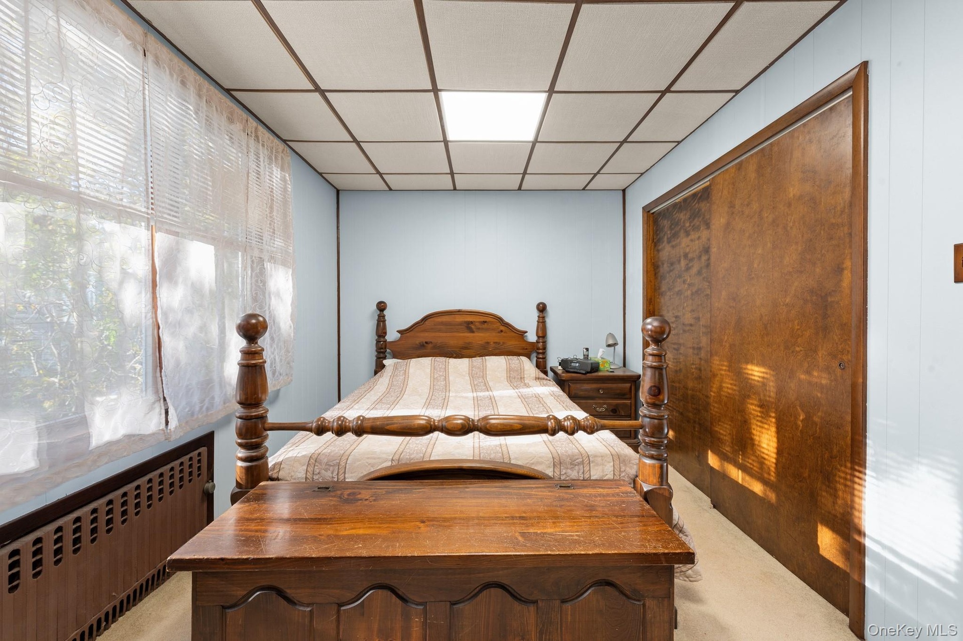 - Bedroom featuring radiator heating unit, a drop ceiling, and light carpet