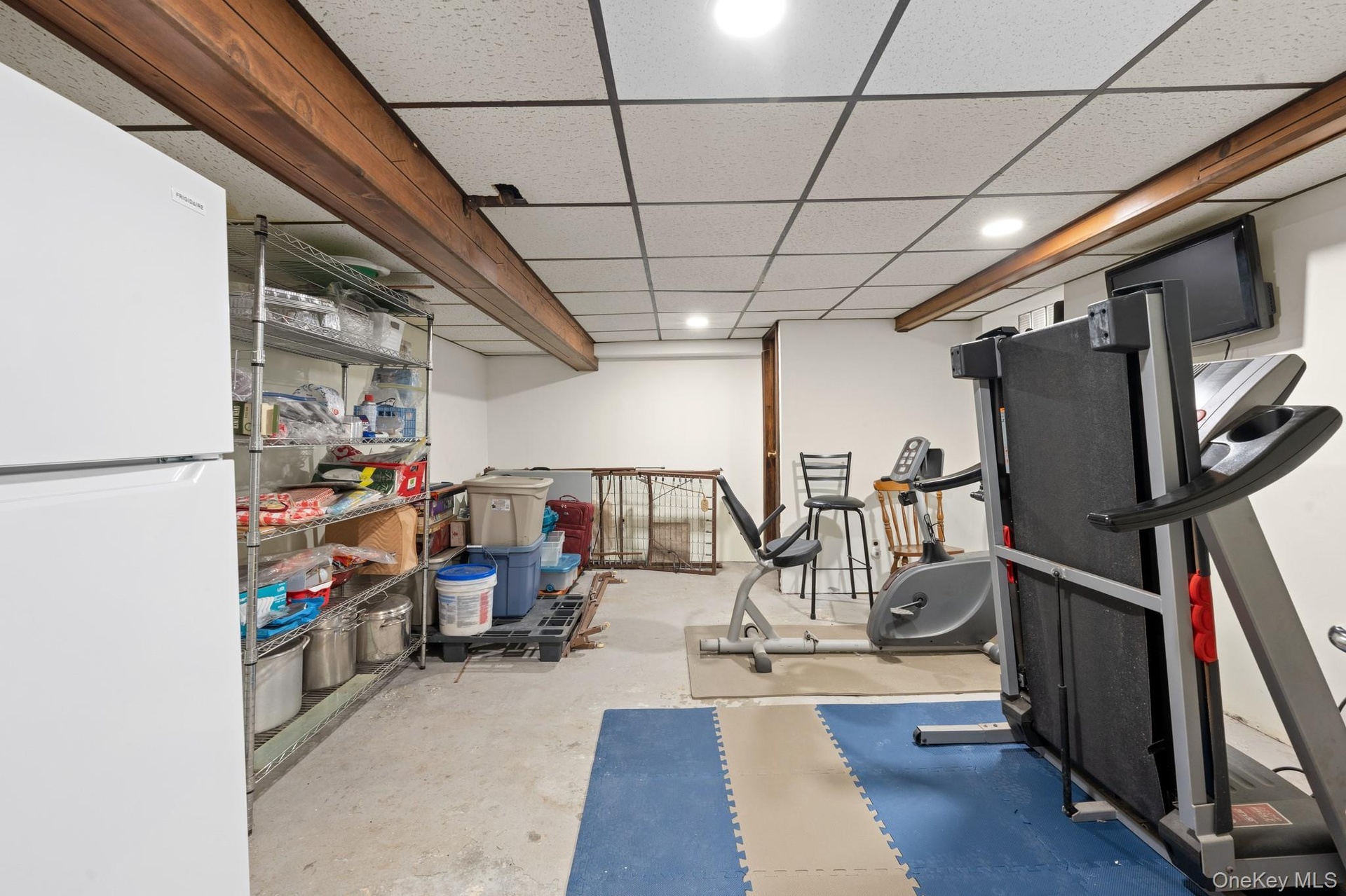 - Workout room with concrete floors, a paneled ceiling, and recessed lighting
