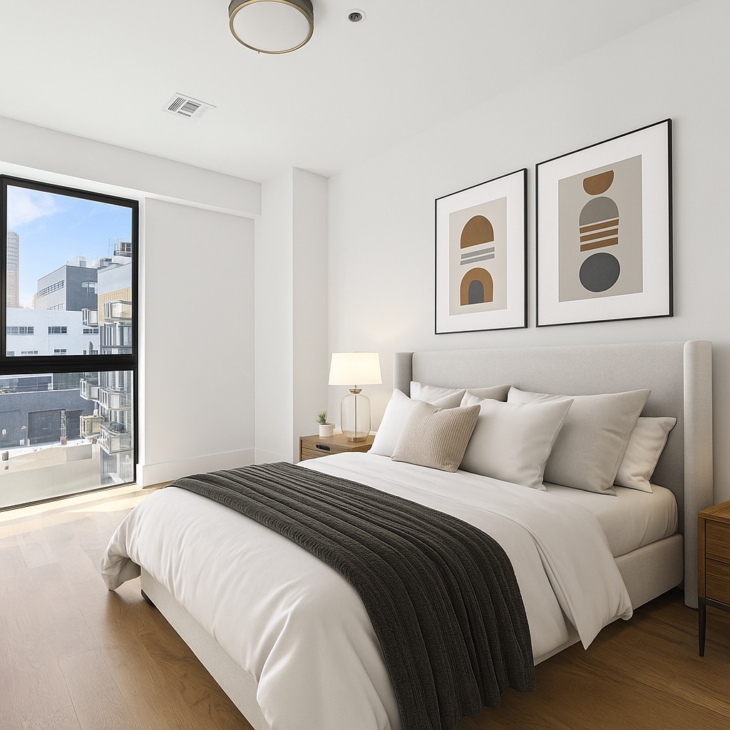 This spacious one-bedroom home offers floor-to-ceiling windows, a modern chef’s kitchen with high-end appliances, abundant closet space, hardwood flooring throughout, an expansive bathroom, and the convenience of an in-unit washer & dryer.
