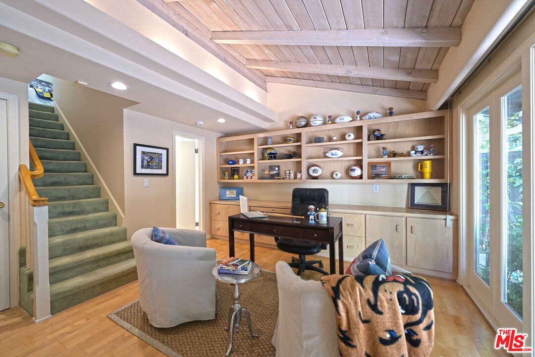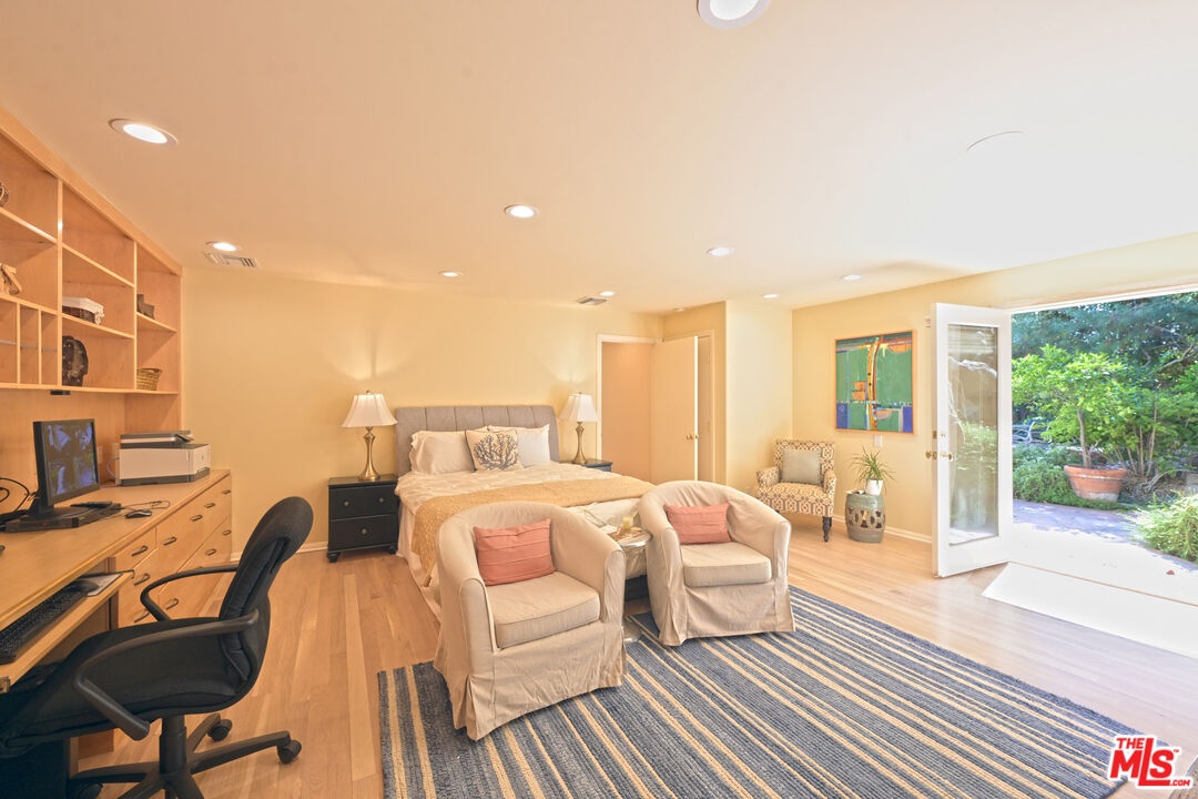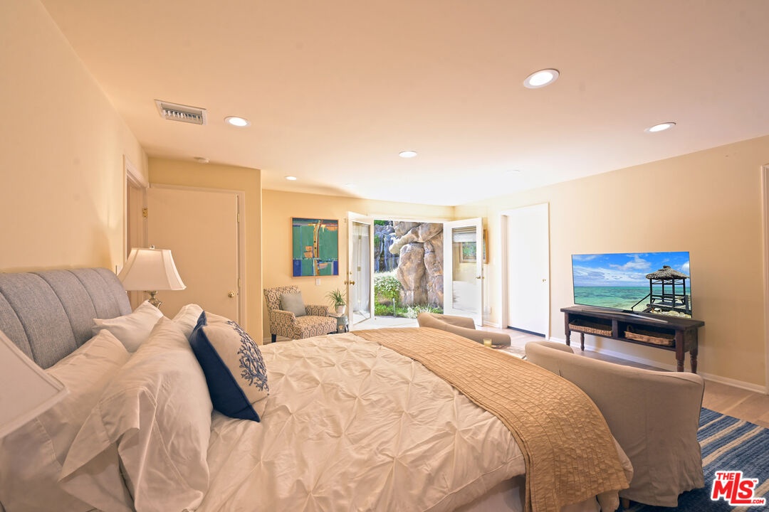 Prime Brentwood location! This spacious home offers a gourmet kitchen, abundant closets, excellent storage, a refrigerated wine closet plus the living room, dining room and office - all with French doors, open to a large patio & pool. The huge primary suite includes a private outdoor spa and balcony, while the luxurious bath features a jetted two-person tub and an exceptionally large shower. The resort-style backyard is perfect for entertaining with a lagoon pool and tranquil waterfall. Award-winning Kenter Canyon Elementary is just moments away. This home has it all, combining comfort, style, and convenience.