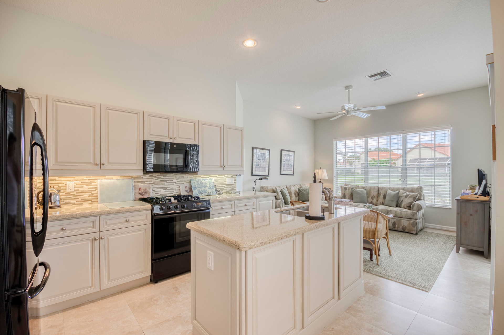 Welcome to this 2,023 sq ft CBS single-family home, featuring 3 bedrooms and 3 bathrooms in the prestigious Masters at Eagleton neighborhood of PGA National. The bright living room is filled with natural light from sliding glass doors and recessed ceiling lighting, complemented by off-white walls and neutral stone-look tile. Adjacent, the formal dining area offers a chandelier, wall sconces, and recessed lighting, seamlessly connecting to the open-concept living space. The kitchen boasts linen-toned paneled cabinets, granite countertops, a neutral mosaic glass tile backsplash, black appliances, a prep island with sink and dishwasher, and a sunny breakfast nook in a bay window. The cozy family room overlooks tranquil lake views and provides access to the covered patio. A spacious office