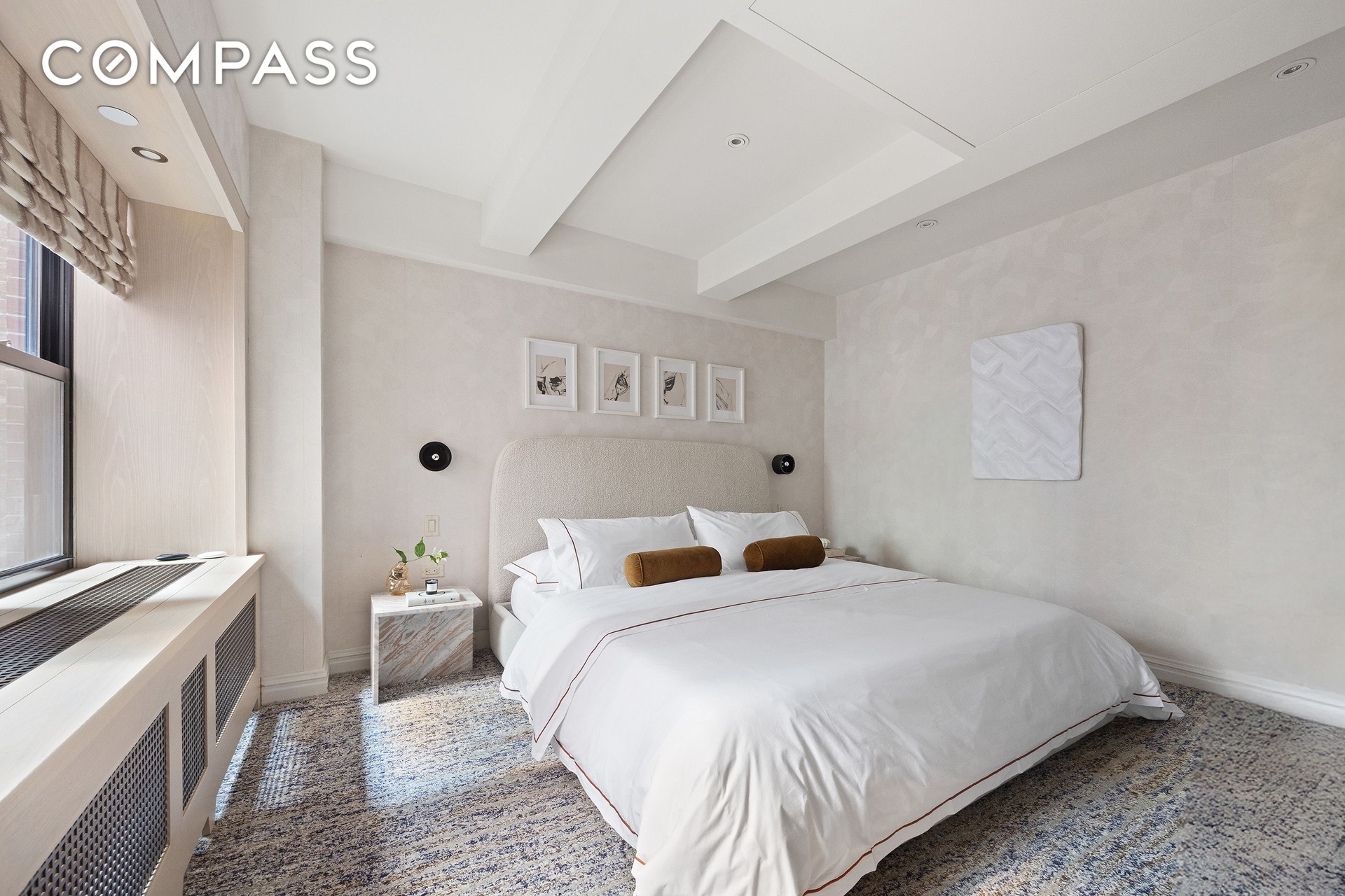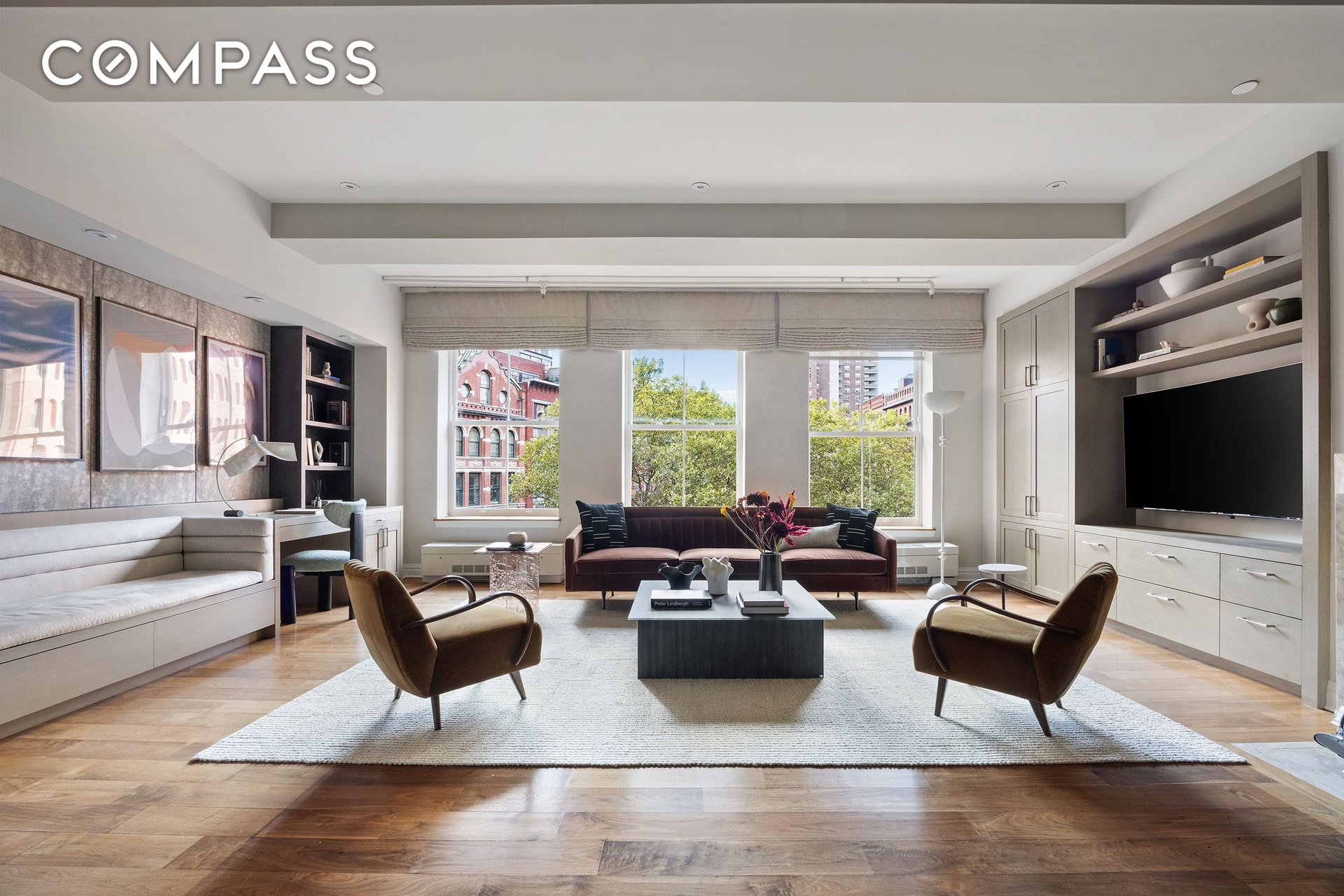 This spacious three-bedroom, two-and-a-half-bath duplex spans over 2,300 square feet and is ideally situated just across from Duane Park. A private elevator opens directly into a bright great room, highlighted by a wood-burning fireplace, beamed ceilings, and oversized windows that frames serene treetop park views.
