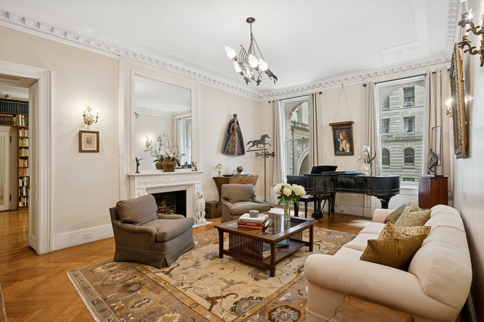 The centerpiece of the apartment is a magnificent grand living room featuring soaring ceilings, intricate moldings, and a wood-burning fireplace-perfectly suited for elegant entertaining. A baby grand piano further elevates the ambiance, creating an atmosphere of timeless luxury.