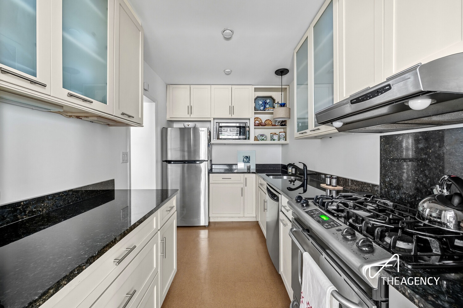 Adjacent to the living room is a spacious, windowed dining area that can also serve as a flexible den, library, or guest space. The renovated two-entry, non-galley kitchen features granite countertops, stainless steel GE appliances, and excellent storage, making it both efficient and inviting for cooking and entertaining.