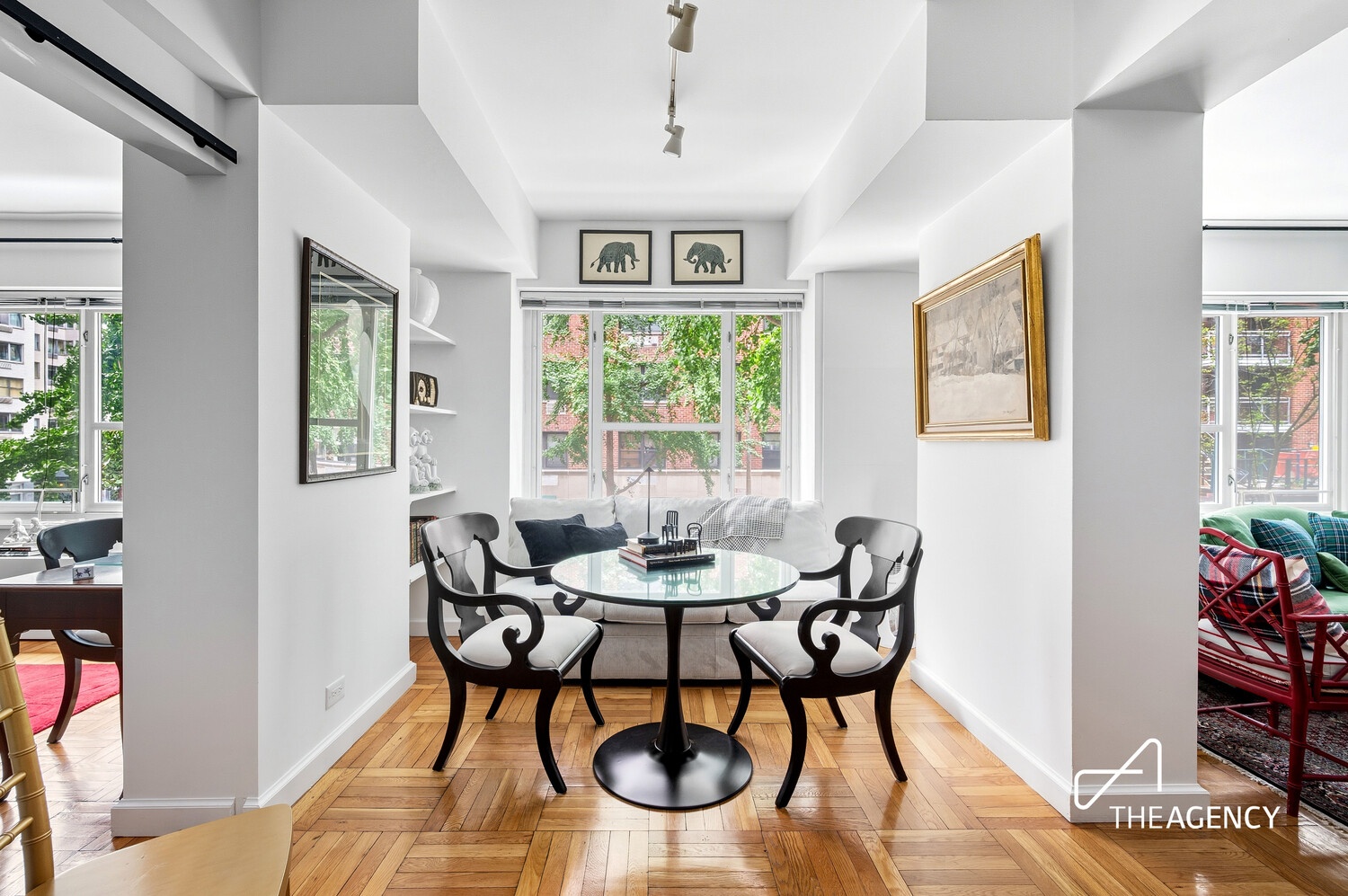 Upon arrival, you are welcomed by a formal entry foyer that sets the tone for this classic home. The expansive living room is complete with built-in bookcases accented by recessed lighting, offering both architectural charm and functionality. Large windows frame lovely tree-top views over 55th Street, and the entire apartment is kept comfortable year-round with newly installed wall-through A/C units.