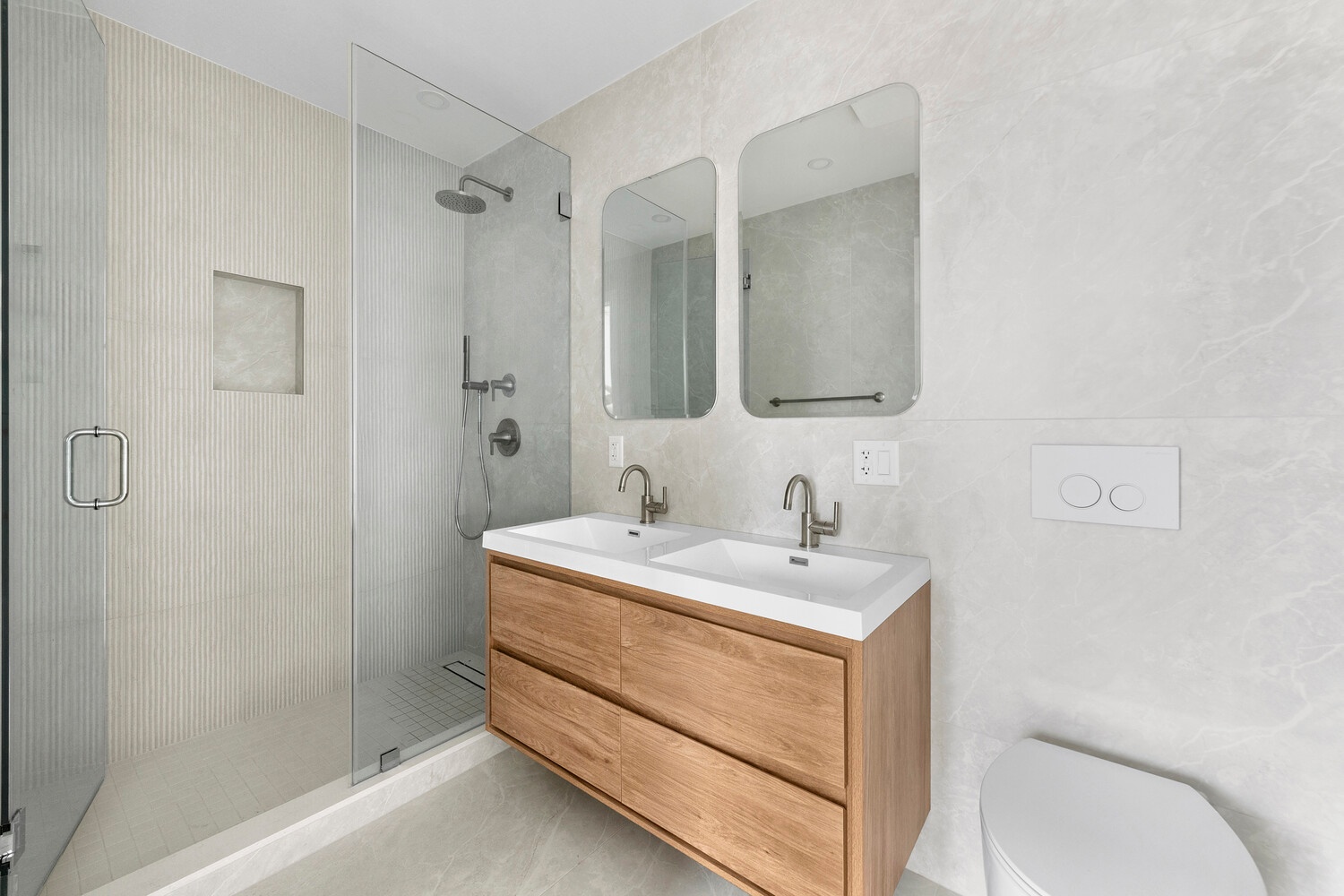 Upstairs, the primary suite offers a spacious retreat with two closets, a double-vanity bath, and a refined glass-enclosed shower. From this level, doors open directly to a wraparound terrace-an expansive outdoor extension of the home, ideal for entertaining, relaxing under the skyline, or simply taking in sweeping city views.