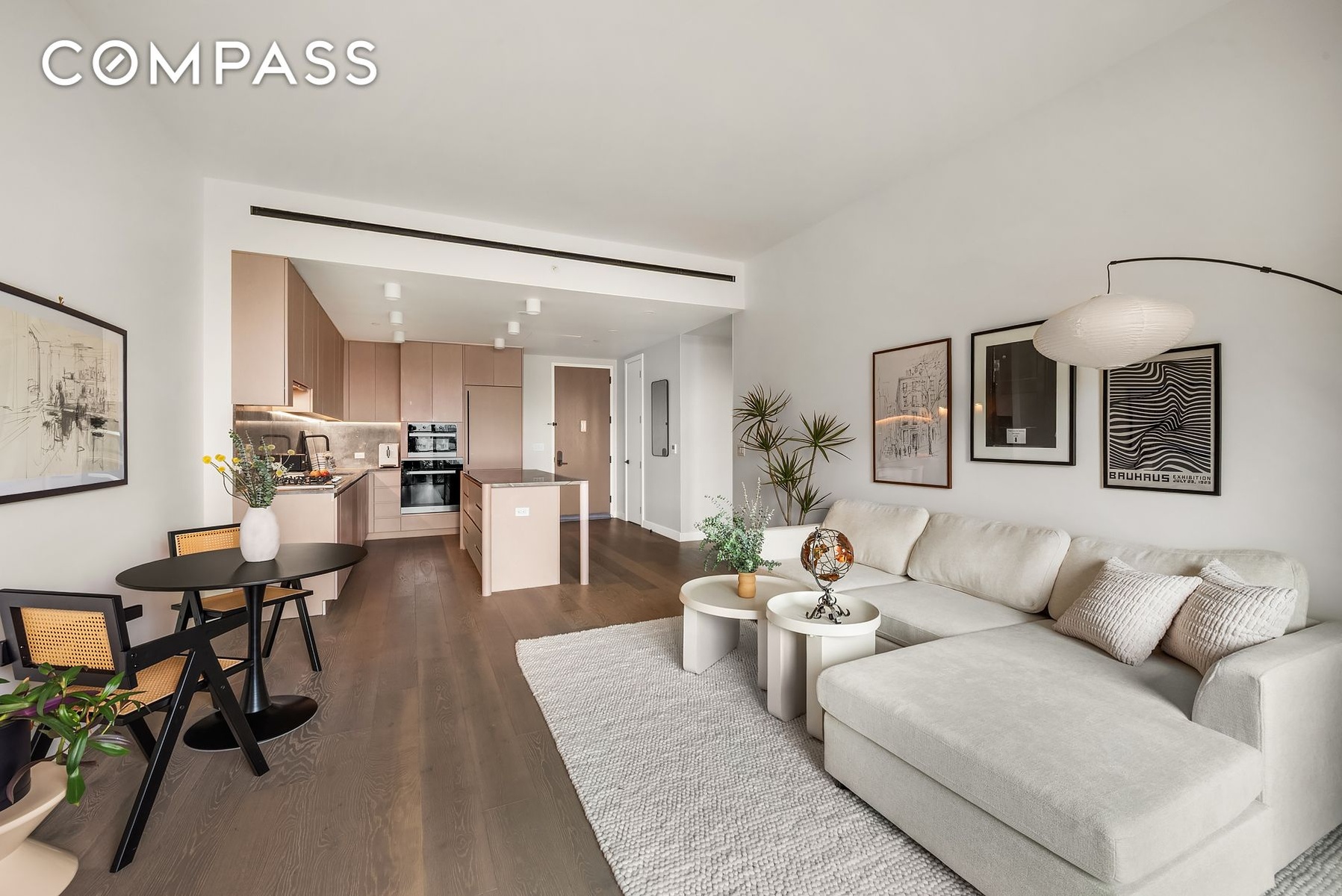 Upon entering Residence 5H, you are greeted by a spacious foyer with a coat closet, leading seamlessly into the sun-filled open-concept living, dining, and kitchen areas.