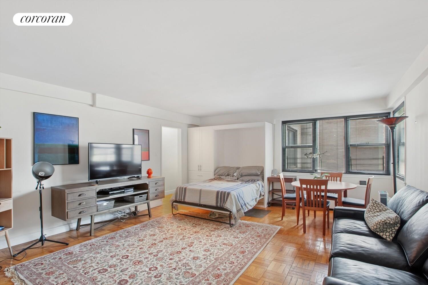 Welcome to this beautifully situated corner studio apartment, ideally located in the desired Lenox Hill neighborhood of the Upper East Side. This home is nestled within a pristine 24 hour doorman, full-service cooperative, equipped with a well-situated gym, newly renovated laundry facilities, and an exceptional roof deck with sweeping city views.