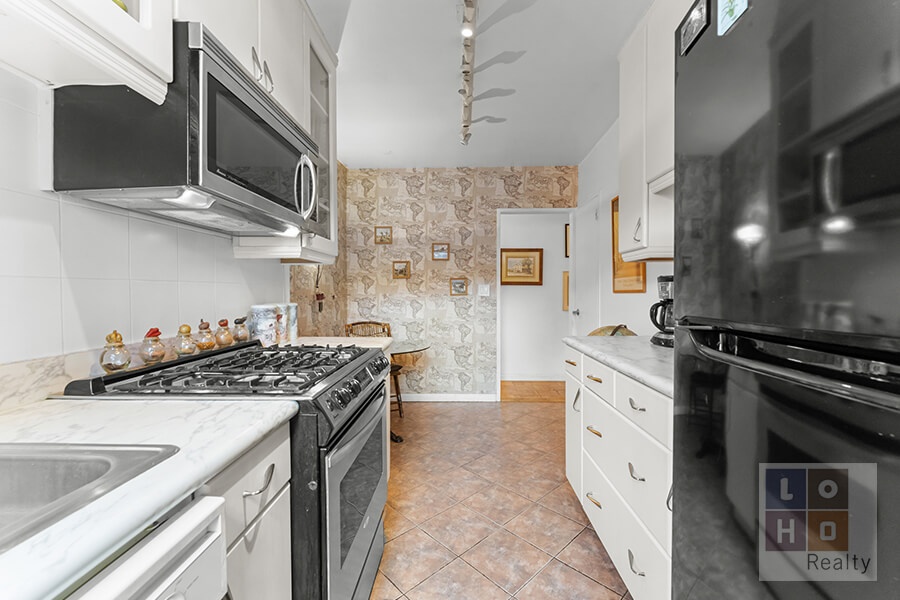 Additional highlights include 8’ ceilings, hardwood parquet floors, updated moldings, and four large closets—including a floor-to-ceiling walk-in closet in the bedroom—providing excellent storage throughout.