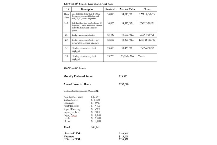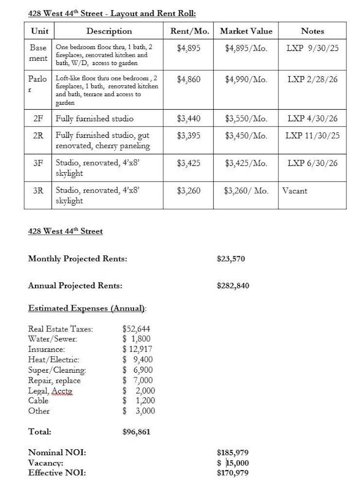 The Parlor and Garden apartments are each one bedrooms and share a bright south facing landscaped garden. The 3rd and 4th floors each have two studio rental apartments. The building can be delivered entirely vacant. The building has significant unused FAR which may be used to add a fifth floor and extend the rear. (Check with your architect.) This building is in the Special Clinton Zoning District which is intended to preserve the low rise character of the neighborhood. Within walking distance are Midtown offices, Broadway theatres, Hudson Yards, Manhattan West offices, Hudson River Park, subways A,C,E,7,N, Q,R,1,2,3. Owner/Broker