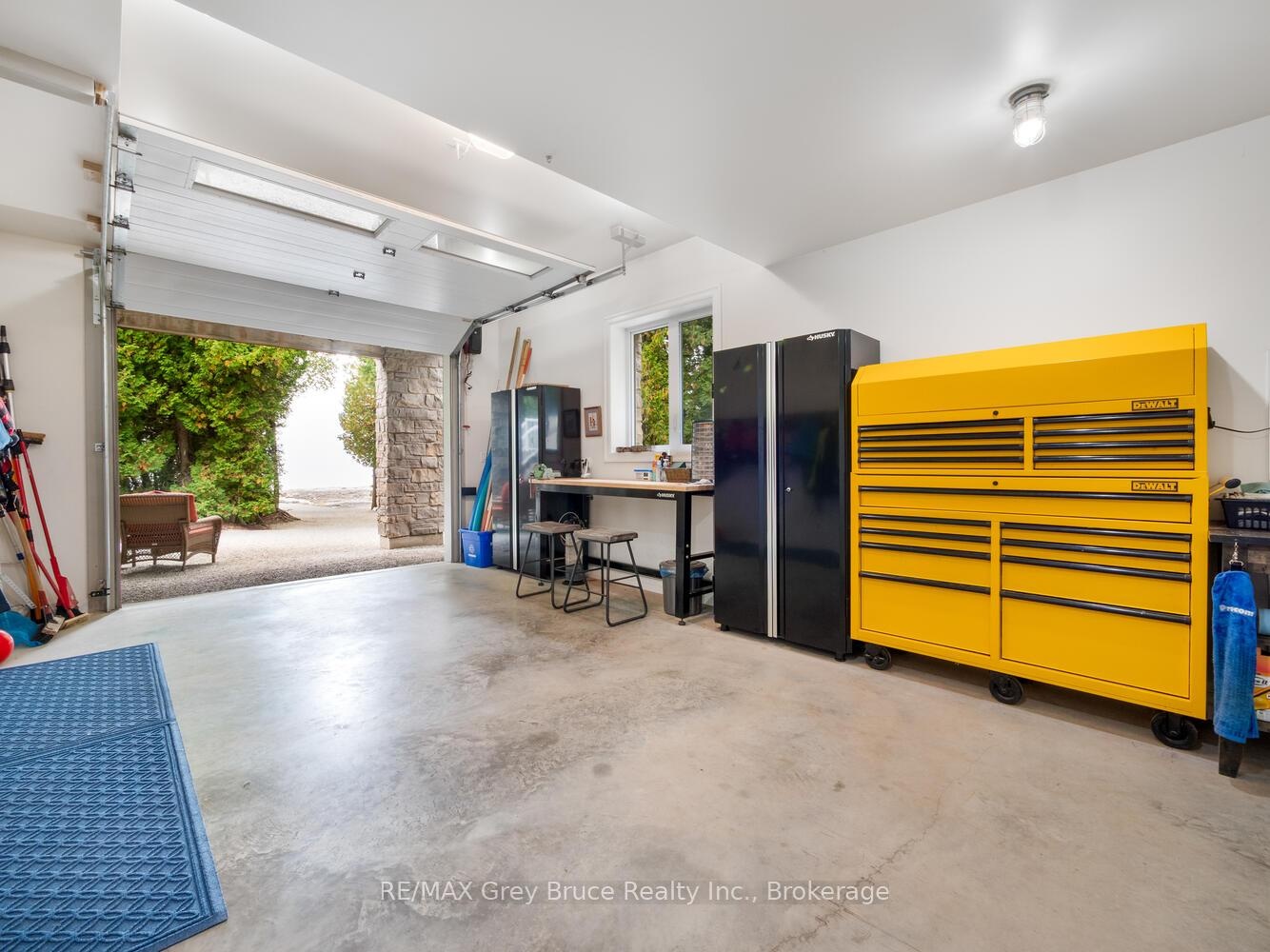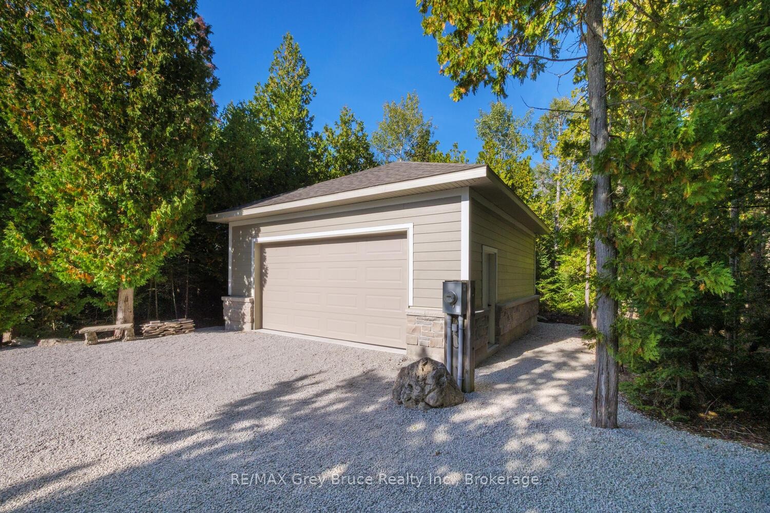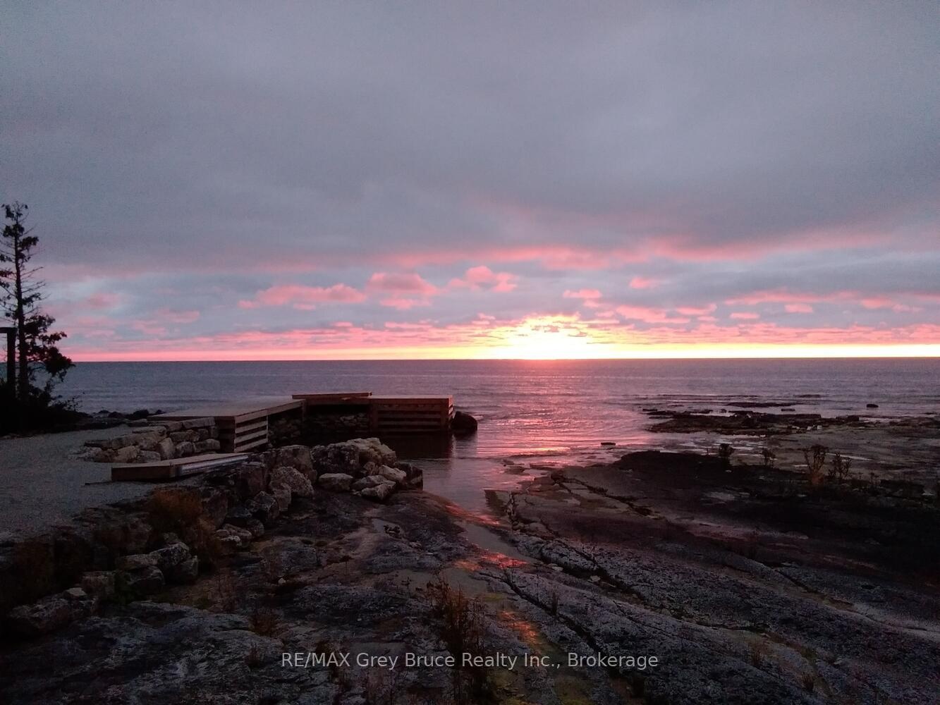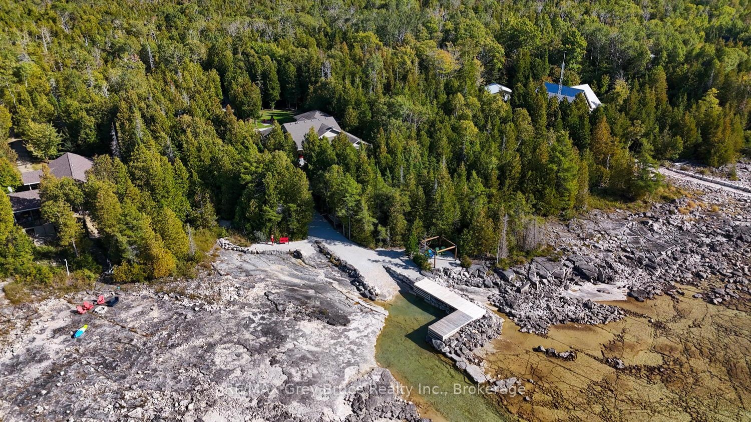 Breathtaking views, quality craftsmanship, and true pride of ownership! Set on a private 1.4-acre lot in a sought-after neighborhood, this well-maintained property features a gently curved driveway leading directly to the clean shoreline of Lake Huron. A dredged channel and L-shaped dock offer a protected harbour perfect for small boats, kayaks, or swimming. Relax under the timber framed pergola with Toja Grid sunshade and take in stunning sunsets by the water. The exterior boasts low-maintenance James Hardie siding and local Wiarton stone. With over 540 sq.ft. of decking - including durable, splinter-free Brazilian Ipe hardwood - there is plenty of space to entertain outdoors. Inside, a large foyer opens to an elegant living space with coffered ceilings, a stone fireplace, and Maple hardwood floors. The custom kitchen is characterized by the Titanium black granite countertops and Hubbardton Forge lighting fixtures. Form blends function with an induction cooktop, BI oven/microwave and plenty of storage. Step from the dining room onto a covered deck with a direct gas line for Barbeques or propane fire table. The main-floor primary suite offers water views, two walk-in closets, and a spa-like 5pc ensuite. A mud/laundry room connects to the attached garage for added convenience. The attached garage is fully finished with PVC lined walls. The walk-out lower level includes two spacious bedrooms, a 3pc bath, a large family room with in-floor heating, and a versatile workshop - ideal for hobbies or storage close to the lake. No shortage of storage space with the additional 24x24 detached garage added in 2020, plus a 8x12 storage shed. Additional features include central vacuum, central air conditioning, automatic whole home generator and water treatment system - all for comfort and peace of mind. 2885sq.ft., 3-bedroom, 2.5-bathroom home. First time on the market - this one-owner home invites you to enjoy peace, comfort, and natural beauty on the stunning Bruce Peninsula.